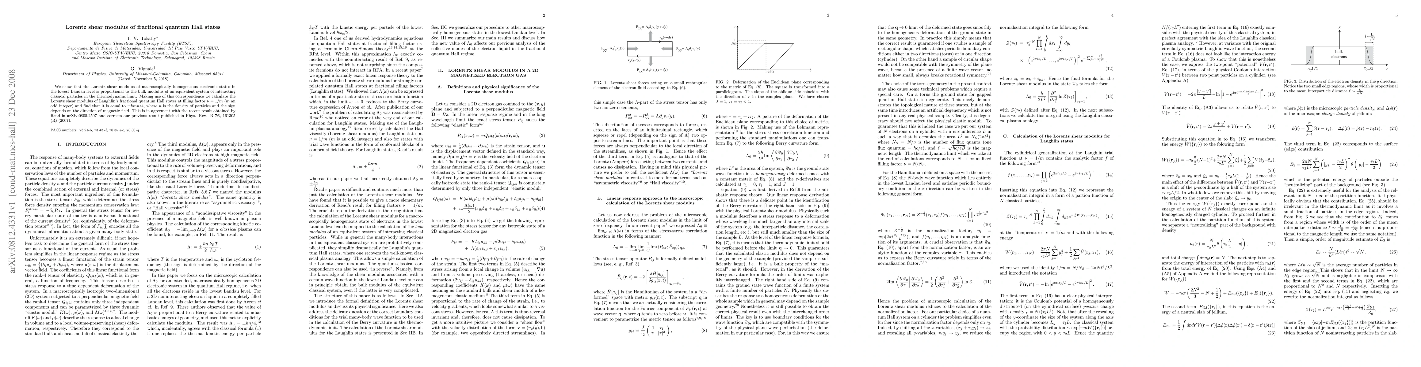 We show that the Lorentz shear modulus of macroscopically homogeneous electronic states in the lowest Landau level is proportional to the bulk modulus of an equivalent system of interacting classical particles in the thermodynamic limit. Making use of this correspondence we calculate the Lorentz shear modulus of Laughlin's fractional quantum Hall states at filling factor $\nu=1/m$ ($m$ an odd integer) and find that it is equal to $\pm \hbar mn/4$, where $n$ is the density of particles and the sign depends on the direction of magnetic field. This is in agreement with the recent result obtained by Read in arXiv:0805.2507 and corrects our previous result published in Phys. Rev. B {\bf 76}, 161305 (R) (2007).