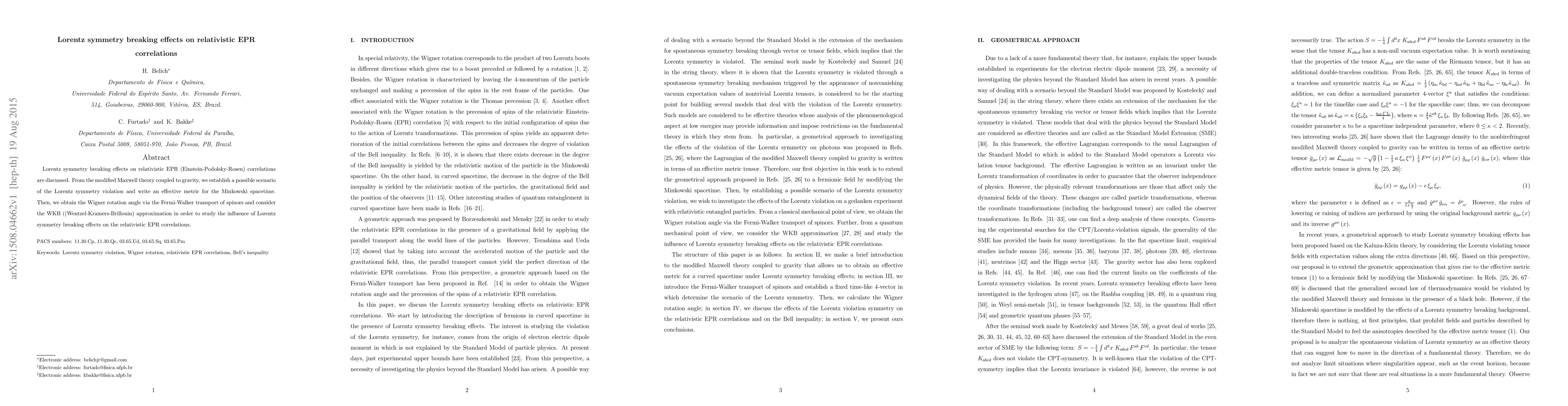This paper investigates how Lorentz symmetry breaking influences relativistic Einstein-Podolsky-Rosen (EPR) correlations, proposing a modified Maxwell theory coupled to gravity to establish a scenario of symmetry violation and deriving an effective metric for Minkowski spacetime. The study uses the Fermi-Walker transport of spinors and the WKB approximation to analyze the impact on EPR correlations.