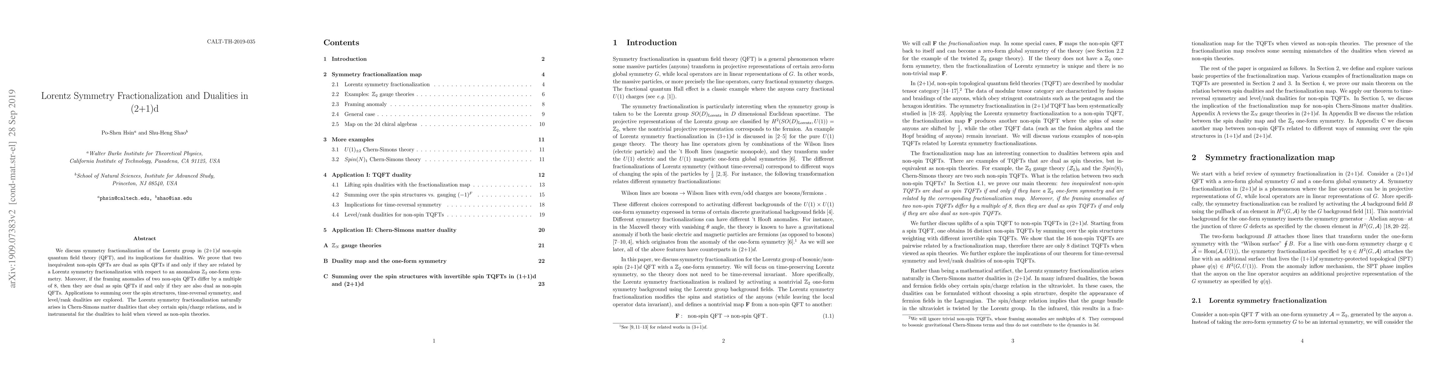 This paper explores the fractionalization of Lorentz symmetry in (2+1)d non-spin quantum field theories (QFTs) and demonstrates its implications for dualities. It proves that dualities between inequivalent non-spin QFTs emerge from Lorentz symmetry fractionalization with respect to an anomalous $\mathbb{Z}_2$ one-form symmetry, with specific applications to Chern-Simons matter dualities and various symmetry considerations.