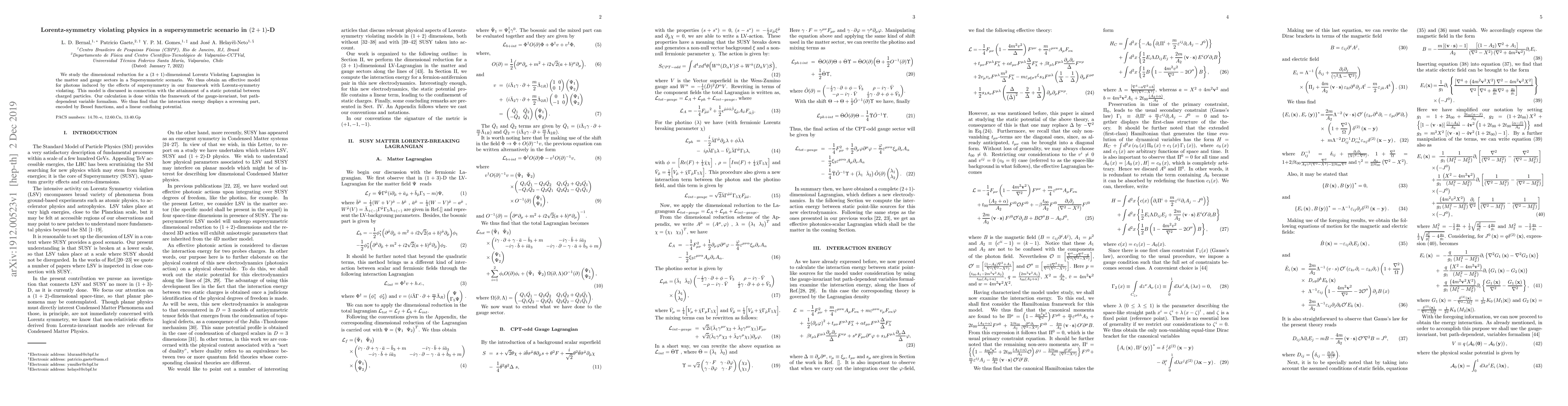 We study the dimensional reduction for a $(3+1)$-dimensional Lorentz Violating Lagrangian in the matter and gauge sectors in a Supersymmetric scenario. We thus obtain an effective model for photons induced by the effects of supersymmetry in our framework with Lorentz-symmetry violating. This model is discussed in connection with the attainment of a static potential between charged particles. Our calculation is done within the framework of the gauge-invariant, but path-dependent variable formalism. We thus find that the interaction energy displays a screening part, encoded by Bessel functions, and a linear confining potential.