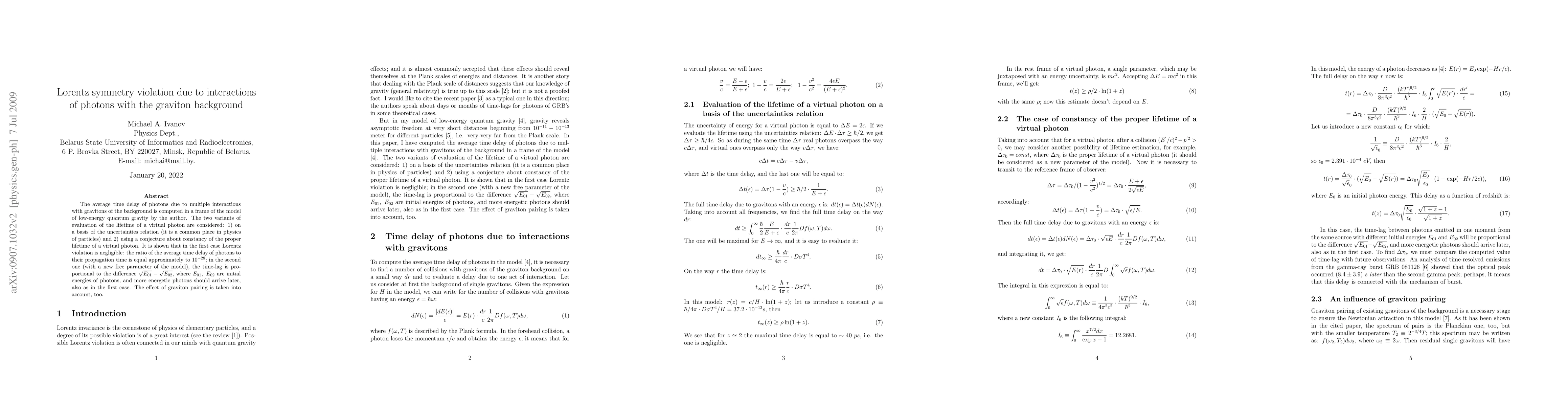 The average time delay of photons due to multiple interactions with gravitons of the background is computed in a frame of the model of low-energy quantum gravity by the author. The two variants of evaluation of the lifetime of a virtual photon are considered: 1$)$ on a basis of the uncertainties relation (it is a common place in physics of particles) and 2$)$ using a conjecture about constancy of the proper lifetime of a virtual photon. It is shown that in the first case Lorentz violation is negligible: the ratio of the average time delay of photons to their propagation time is equal approximately to $10^{-28}$; in the second one (with a new free parameter of the model), the time-lag is proportional to the difference $\sqrt{E_{01}}-\sqrt{E_{02}}$, where $E_{01}, E_{02}$ are initial energies of photons, and more energetic photons should arrive later, also as in the first case. The effect of graviton pairing is taken into account, too.