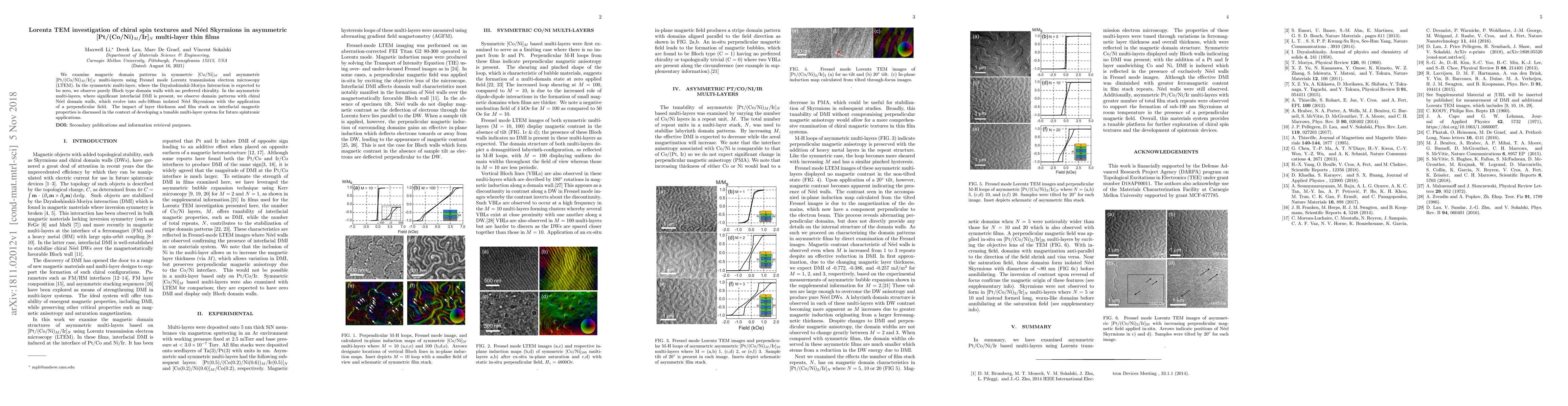 This study uses Lorentz TEM to investigate magnetic domain patterns in symmetric and asymmetric multi-layer thin films, revealing chiral N\'eel domain walls and Skyrmions in asymmetric layers due to interfacial Dzyaloshinskii-Moriya Interaction, with implications for tunable spintronic devices.