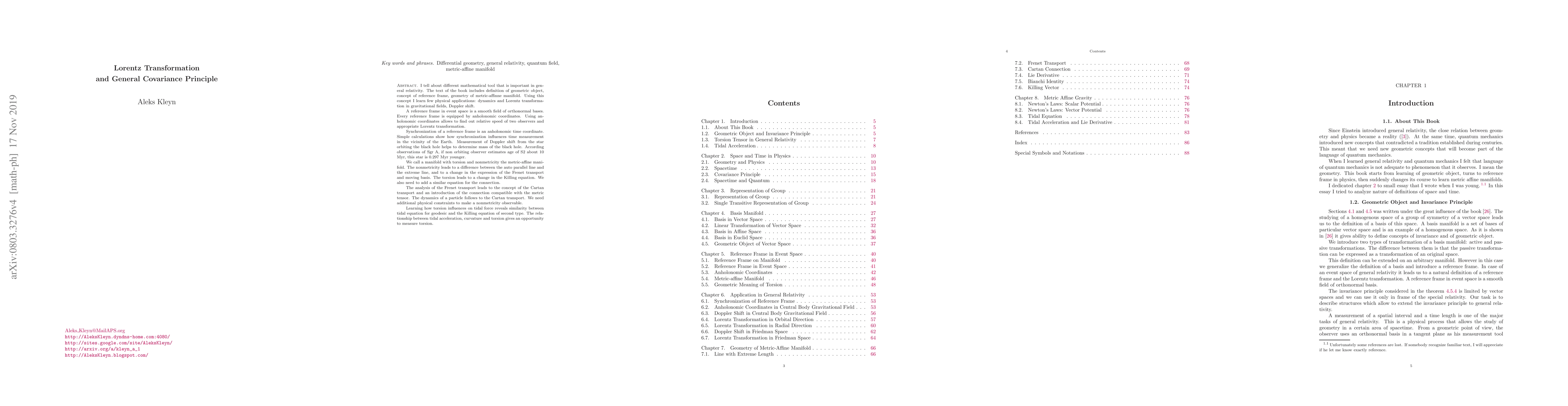 I tell about different mathematical tool that is important in general relativity. The text of the book includes definition of geometrical object, concept of reference frame, geometry of metric-affinne manifold. Using this concept I learn few physical applications: dynamics and Lorentz transformation in gravitational fields, Doppler shift. A reference frame in event space is a smooth field of orthonormal bases. Every reference frame is equipped by anholonomic coordinates. Using anholonomic coordinates allows to find out relative speed of two observers and appropriate Lorentz transformation. Synchronization of a reference frame is an anholonomic time coordinate. Simple calculations show how synchronization influences time measurement in the vicinity of the Earth. Measurement of Doppler shift from the star orbiting the black hole helps to determine mass of the black hole. We call a manifold with torsion and nonmetricity the metric\hyph affine manifold. The nonmetricity leads to a difference between the auto parallel line and the extreme line, and to a change in the expression of the Frenet transport and moving basis. The torsion leads to a change in the Killing equation. We also need to add a similar equation for the connection. The analysis of the Frenet transport leads to the concept of the Cartan transport and an introduction of the connection compatible with the metric tensor. The dynamics of a particle follows to the Cartan transport. We need additional physical constraints to make a nonmetricity observable. Learning how torsion influences on tidal force reveals similarity between tidal equation for geodesic and the Killing equation of second type.
