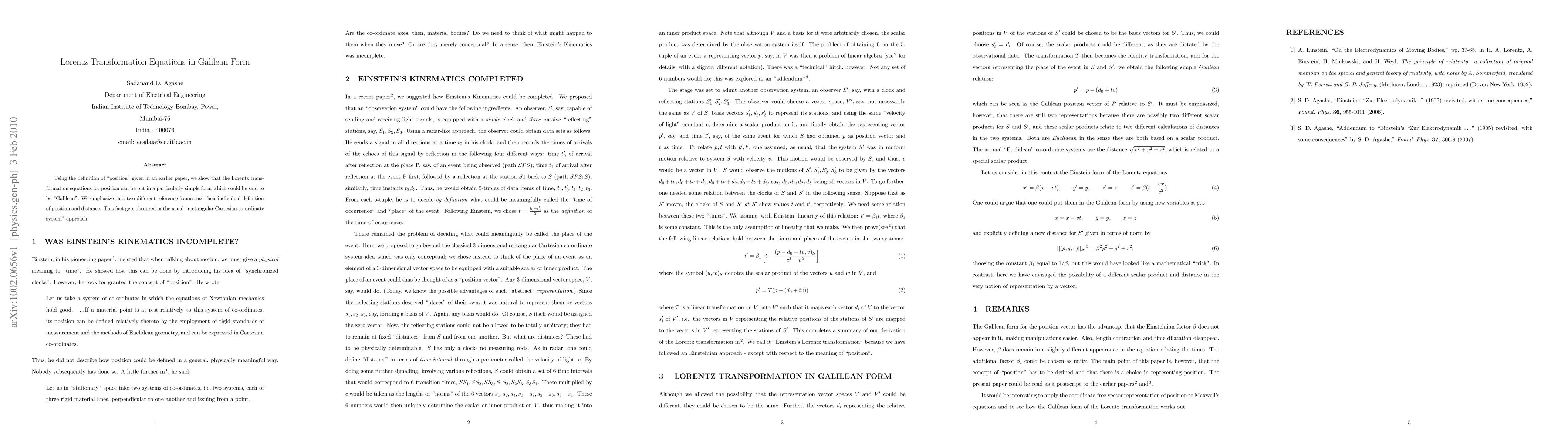Using the notion, developed in an earlier paper, of "representation" of "position" by a vector in a vector space with an inner product, we show that the Lorentz Transformation Equations relating positions in two different reference frames can be put in a particularly simple form which could be said to be "Galilean". We emphasize that two different reference frames can use a common vector space for representation but with two different inner products. The inner products are defined through the observational set-up of each frame.