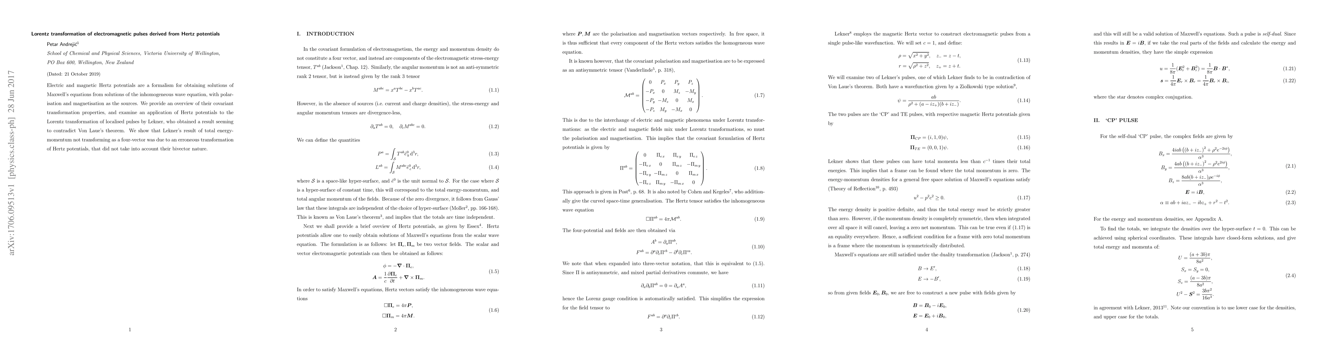 This paper reviews the covariant transformation properties of Hertz potentials and corrects Lekner's erroneous Lorentz transformation of electromagnetic pulses, demonstrating that the total energy-momentum transforms correctly as a four-vector when properly accounting for the bivector nature of Hertz potentials.