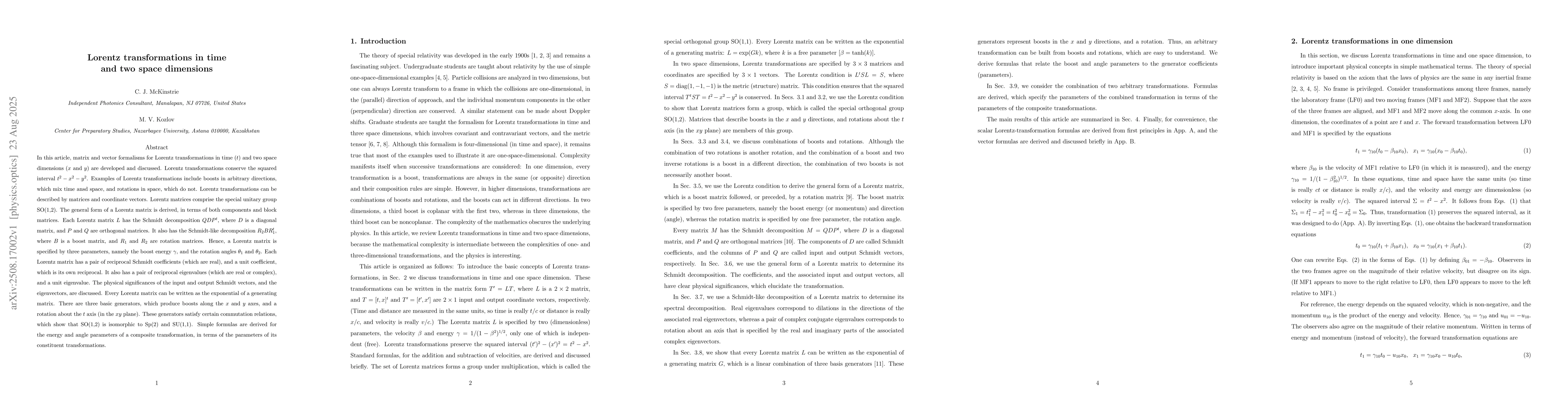 In this article, matrix and vector formalisms for Lorentz transformations in time ($t$) and two space dimensions ($x$ and $y$) are developed and discussed. Lorentz transformations conserve the squared interval $t^2 - x^2 - y^2$. Examples of Lorentz transformations include boosts in arbitrary directions, which mix time ansd space, and rotations in space, which do not. Lorentz transformations can be described by matrices and coordinate vectors. Lorentz matrices comprise the special unitary group SO(1,2). The general form of a Lorentz matrix is derived, in terms of both components and block matrices. Each Lorentz matrix $L$ has the Schmidt decomposition $QDP^t$, where $D$ is a diagonal matrix, and $P$ and $Q$ are orthogonal matrices. It also has the Schmidt-like decomposition $R_2BR_1^t$, where $B$ is a boost matrix, and $R_1$ and $R_2$ are rotation matrices. Hence, a Lorentz matrix is specified by three parameters, namely the boost energy $\gamma$, and the rotation angles $\theta_1$ and $\theta_2$. Each Lorentz matrix has a pair of reciprocal Schmidt coefficients (which are real), and a unit coefficient, which is its own reciprocal. It also has a pair of reciprocal eigenvalues (which are real or complex), and a unit eigenvalue. The physical significances of the input and output Schmidt vectors, and the eigenvectors, are discussed. Every Lorentz matrix can be written as the exponential of a generating matrix. There are three basic generators, which produce boosts along the $x$ and $y$ axes, and a rotation about the $t$ axis (in the $xy$ plane). These generators satisfy certain commutation relations, which show that SO(1,2) is isomorphic to Sp(2) and SU(1,1). Simple formulas are derived for the energy and angle parameters of a composite transformation, in terms of the parameters of its constituent transformations.