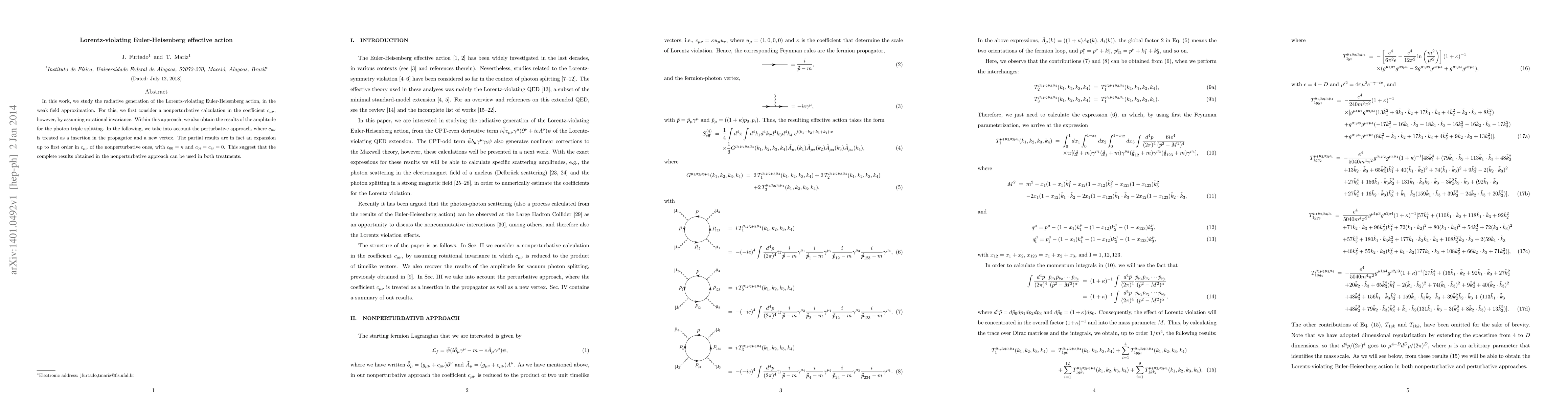 This paper investigates the generation of Lorentz-violating terms in the Euler-Heisenberg effective action through nonperturbative and perturbative methods, revealing that the results align up to first order in the coefficient $c_{\mu\nu}$. The study also examines the photon triple splitting amplitude under rotational invariance.