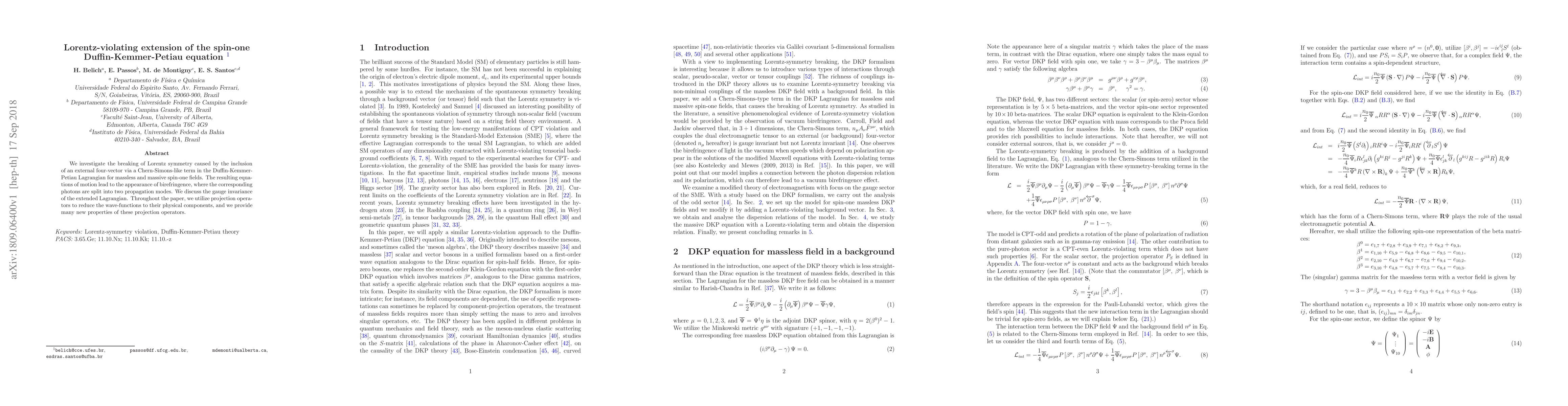 This research explores Lorentz symmetry breaking in a modified Duffin-Kemmer-Petiau equation for spin-one fields, incorporating a Chern-Simons-like term. The study reveals birefringence, splitting photons into two propagation modes, and examines the gauge invariance of the extended Lagrangian, utilizing projection operators for wave-function analysis.