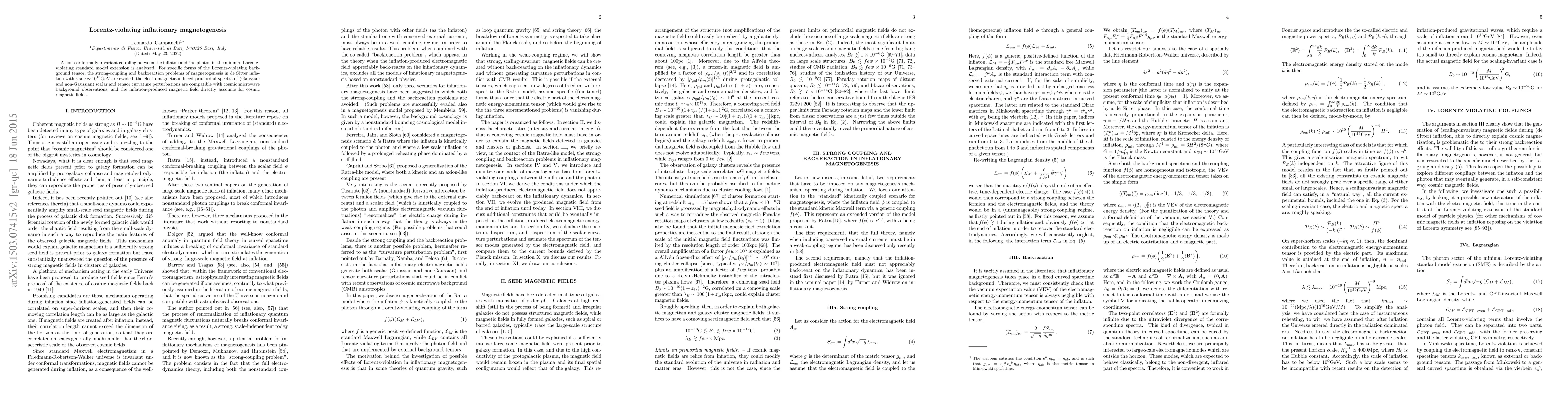 This paper examines a Lorentz-violating coupling in the minimal standard model extension, proposing it resolves magnetogenesis issues in inflationary cosmology at a scale of $\sim 10^{16}$GeV, while producing compatible primordial spectra and explaining cosmic magnetic fields.