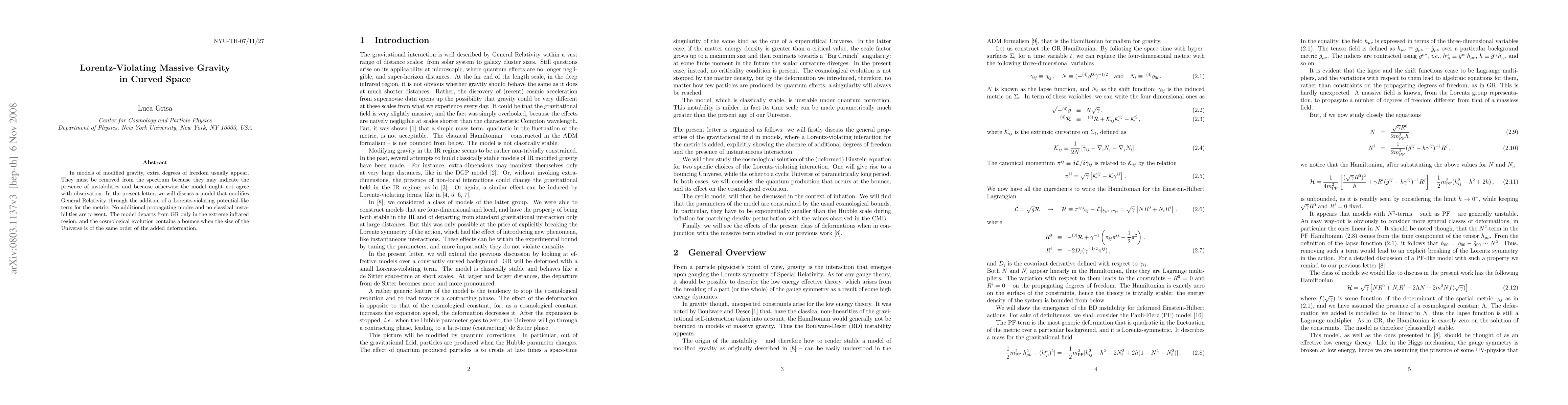 This research introduces a Lorentz-violating massive gravity model that modifies General Relativity without introducing additional propagating modes or classical instabilities. The model differs from GR only at large scales, featuring a cosmological bounce as the universe's size matches the deformation scale.