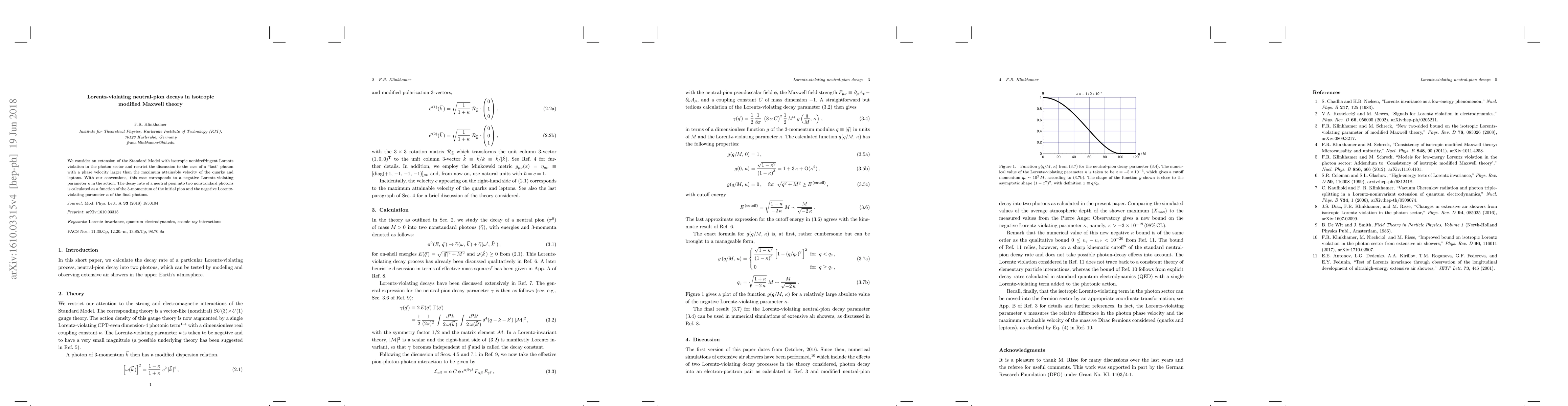 This paper explores an extended Standard Model featuring isotropic Lorentz-violating effects in the photon sector, focusing on scenarios where the photon's phase velocity exceeds that of quarks and leptons. It calculates the decay rate of neutral pions into two nonstandard photons, influenced by a negative Lorentz-violating parameter $\kappa$.