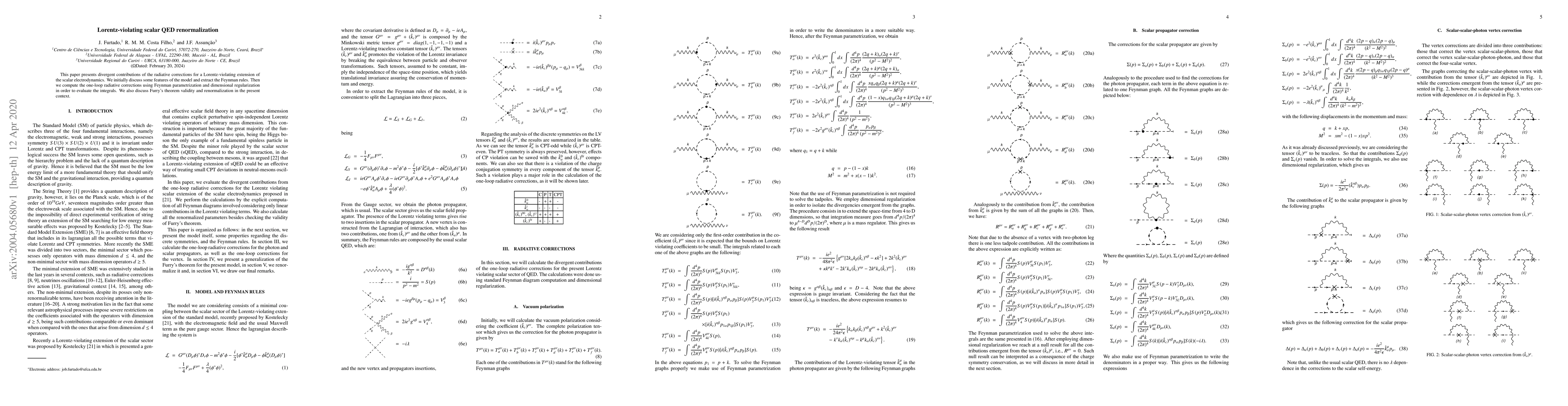This paper investigates radiative corrections in a Lorentz-violating extension of scalar electrodynamics, computing one-loop contributions and evaluating their divergences using Feynman parametrization and dimensional regularization. It also examines the applicability of Furry's theorem and the renormalization process in this context.