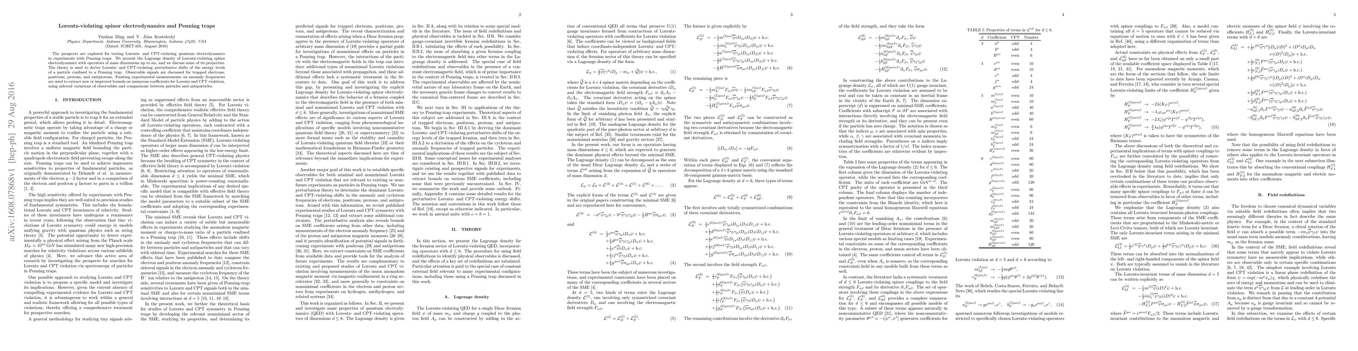 The prospects are explored for testing Lorentz- and CPT-violating quantum electrodynamics in experiments with Penning traps. We present the Lagrange density of Lorentz-violating spinor electrodynamics with operators of mass dimensions up to six, and we discuss some of its properties. The theory is used to derive Lorentz- and CPT-violating perturbative shifts of the energy levels of a particle confined to a Penning trap. Observable signals are discussed for trapped electrons, positrons, protons, and antiprotons. Existing experimental measurements on anomaly frequencies are used to extract new or improved bounds on numerous coefficients for Lorentz and CPT violation, using sidereal variations of observables and comparisons between particles and antiparticles.