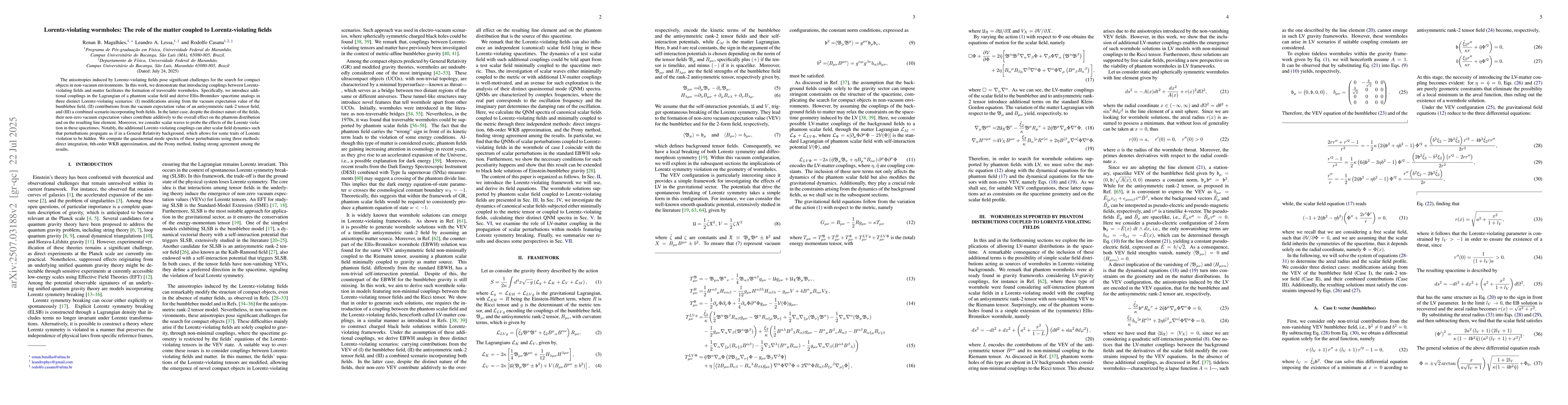 The anisotropies induced by Lorentz-violating fields pose significant challenges for the search for compact objects in non-vacuum environments. In this work, we demonstrate that introducing couplings between Lorentz-violating fields and matter facilitates the formation of traversable wormholes. Specifically, we introduce additional couplings in the Lagrangian of a phantom scalar field and derive Ellis-Bronnikov spacetime analogs in three distinct Lorentz-violating scenarios: (I) modifications arising from the vacuum expectation value of the bumblebee field, (II) contributions from the vacuum expectation value of an antisymmetric rank-2 tensor field, and (III) a combined scenario incorporating both fields. In the latter case, despite the distinct nature of the fields, their non-zero vacuum expectation values contribute additively to the overall effect on the phantom distribution and on the resulting line element. Moreover, we consider scalar waves to probe the effects of the Lorentz violation in these spacetimes. Notably, the additional Lorentz-violating couplings can alter scalar field dynamics such that perturbations propagate as if in a General Relativity background, which allows for some traits of Lorentz violation to be hidden. We compute the quasinormal mode spectra of these perturbations using three methods: direct integration, 6th-order WKB approximation, and the Prony method, finding strong agreement among the results.