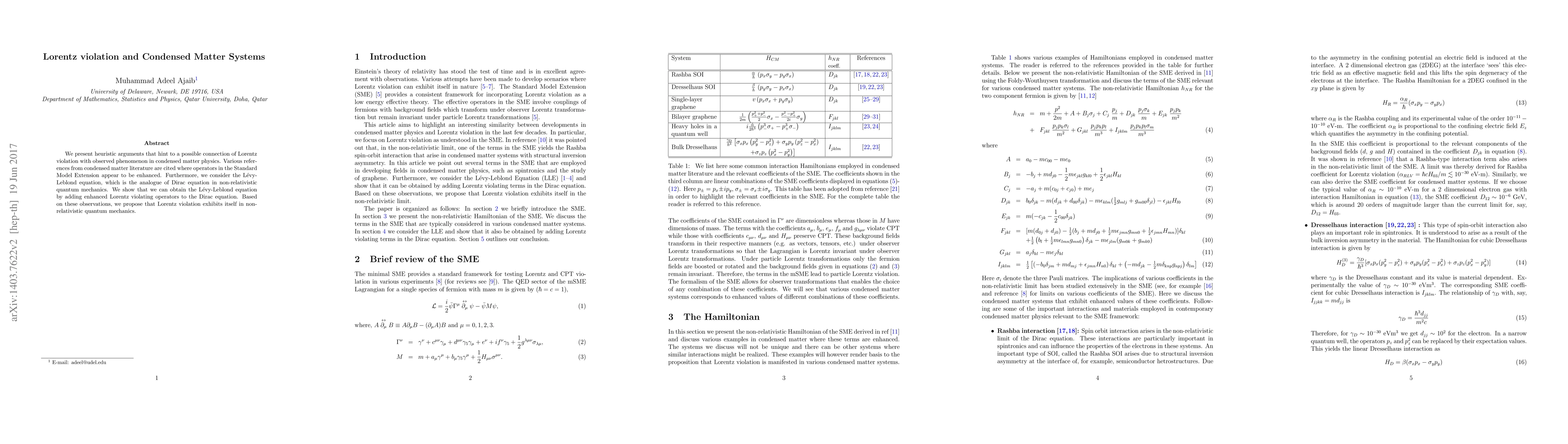 This paper explores a potential link between Lorentz violation and phenomena in condensed matter physics, citing instances where Standard Model Extension operators appear enhanced. It demonstrates that the Levy-Leblond equation, a non-relativistic quantum mechanics analogue of the Dirac equation, can be derived by incorporating these enhanced Lorentz violating operators, suggesting Lorentz violation may manifest in non-relativistic quantum mechanics.