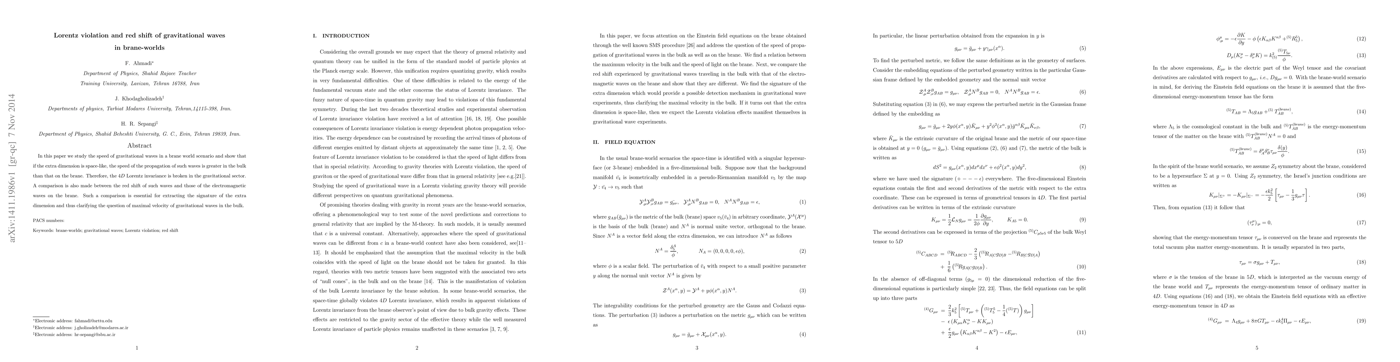 This paper investigates the speed of gravitational waves in a brane-world scenario, demonstrating that in a space-like extra dimension, these waves propagate faster in the bulk than on the brane, thus breaking 4D Lorentz invariance. It also compares the redshift of gravitational waves to electromagnetic waves to identify the signature of the extra dimension.