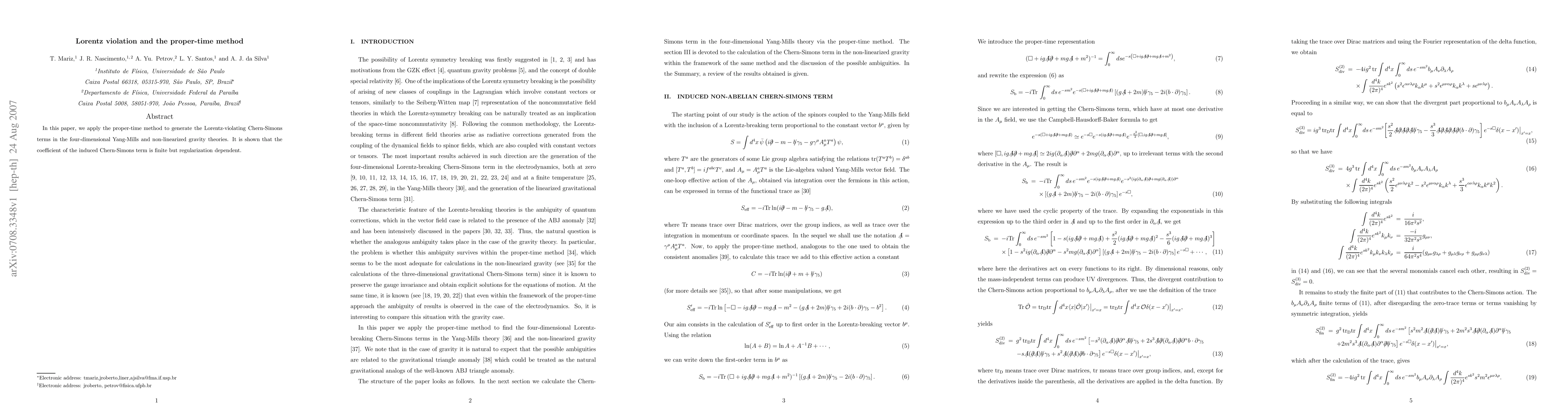 This paper employs the proper-time method to derive Lorentz-violating Chern-Simons terms in four-dimensional Yang-Mills and non-linearized gravity theories, demonstrating that the induced term's coefficient is finite yet reliant on regularization techniques.