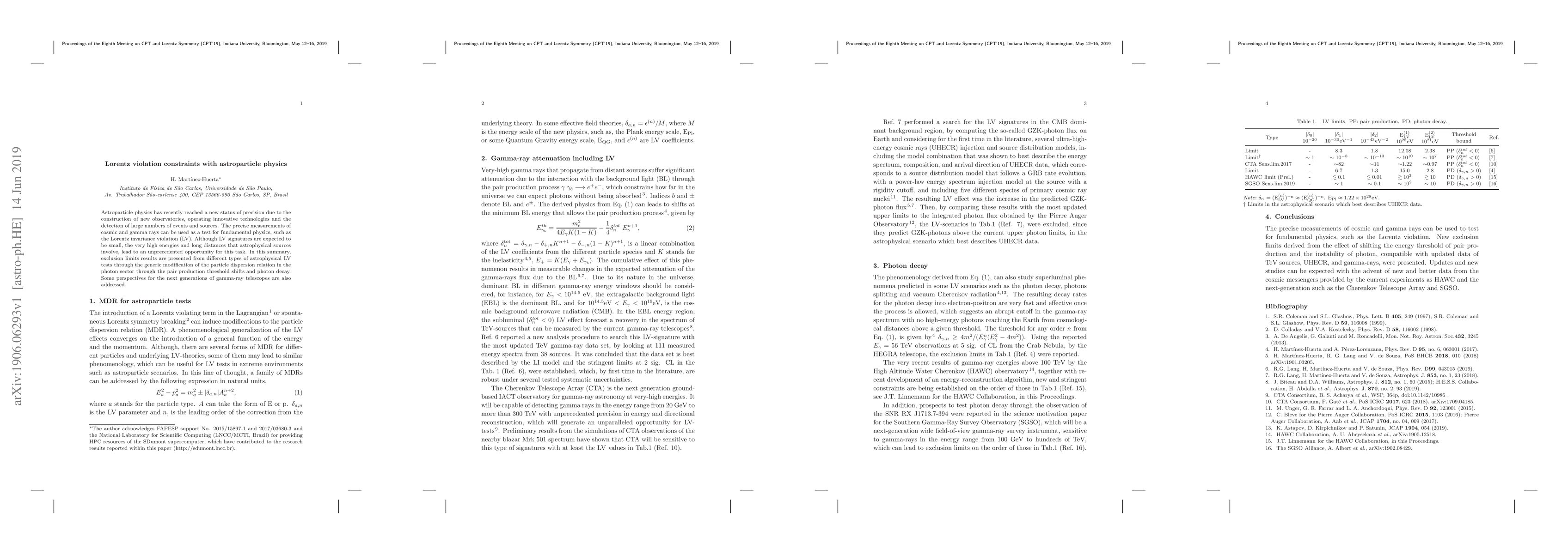 Astroparticle physics has recently reached a new status of precision due to the construction of new observatories, operating innovative technologies and the detection of large numbers of events and sources. The precise measurements of cosmic and gamma rays can be used as a test for fundamental physics, such as the Lorentz invariance violation (LV). Although LV signatures are expected to be small, the very high energies and long distances that astrophysical sources involve, lead to an unprecedented opportunity for this task. In this summary, exclusion limits results are presented from different types of astrophysical LV tests through the generic modification of the particle dispersion relation in the photon sector through the pair production threshold shifts and photon decay. Some perspectives for the next generations of gamma-ray telescopes are also addressed