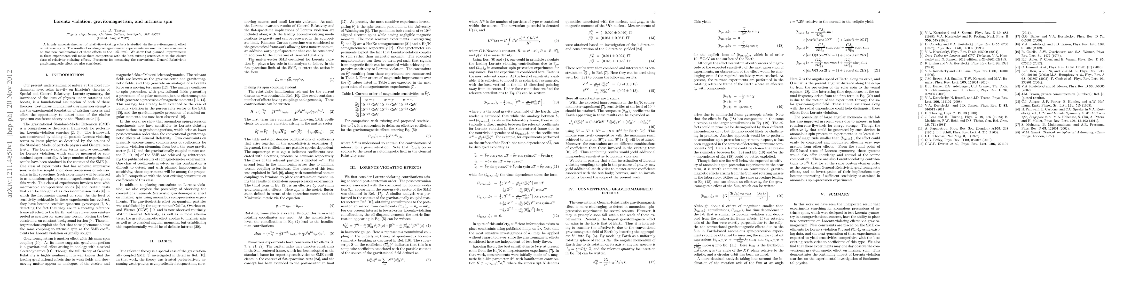 A largely unconstrained set of relativity-violating effects is studied via the gravitomagnetic effect on intrinsic spins. The results of existing comagnetometer experiments are used to place constraints on two new combinations of these effects at the 10% level. We show that planned improvements in these experiments will make them competitive with the best existing sensitivities to this elusive class of relativity-violating effects. Prospects for measuring the conventional General-Relativistic gravitomagnetic effect are also considered.