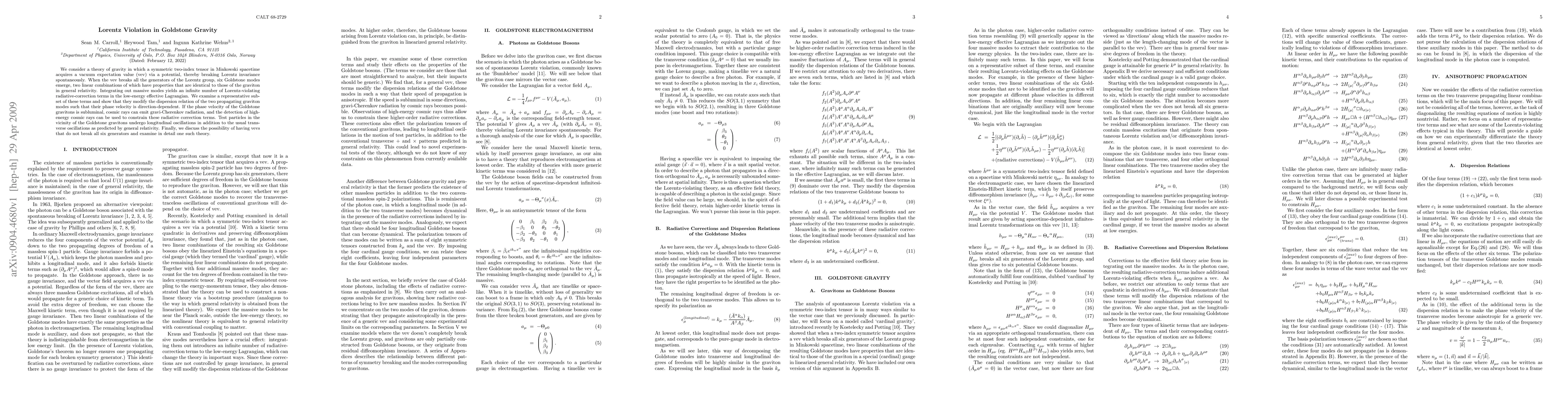 We consider a theory of gravity in which a symmetric two-index tensor in Minkowski spacetime acquires a vacuum expectation value (vev) via a potential, thereby breaking Lorentz invariance spontaneously. When the vev breaks all the generators of the Lorentz group, six Goldstone modes emerge, two linear combinations of which have properties that are identical to those of the graviton in general relativity. Integrating out massive modes yields an infinite number of Lorentz-violating radiative-correction terms in the low-energy effective Lagrangian. We examine a representative subset of these terms and show that they modify the dispersion relation of the two propagating graviton modes such that their phase velocity is direction-dependent. If the phase velocity of the Goldstone gravitons is subluminal, cosmic rays can emit gravi-Cherenkov radiation, and the detection of high-energy cosmic rays can be used to constrain these radiative correction terms. Test particles in the vicinity of the Goldstone gravitons undergo longitudinal oscillations in addition to the usual transverse oscillations as predicted by general relativity. Finally, we discuss the possibility of having vevs that do not break all six generators and examine in detail one such theory.