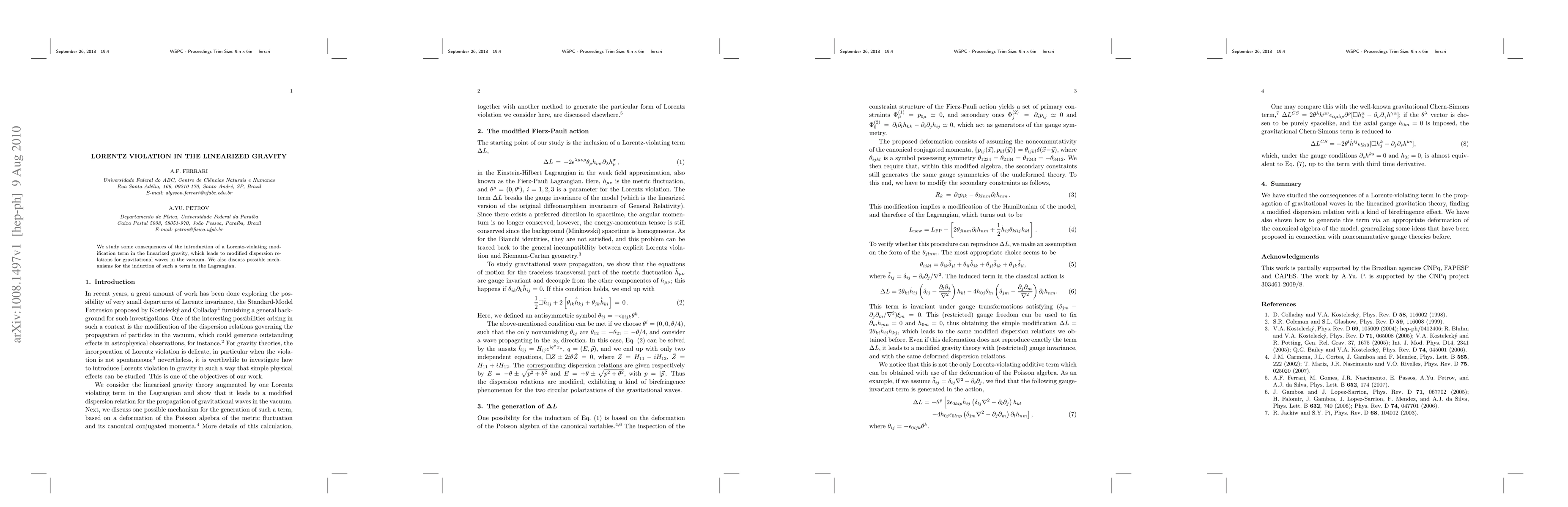 This paper investigates the effects of a Lorentz-violating term in linearized gravity, resulting in altered dispersion relations for gravitational waves. It also explores potential mechanisms for introducing such a term in the gravitational Lagrangian.