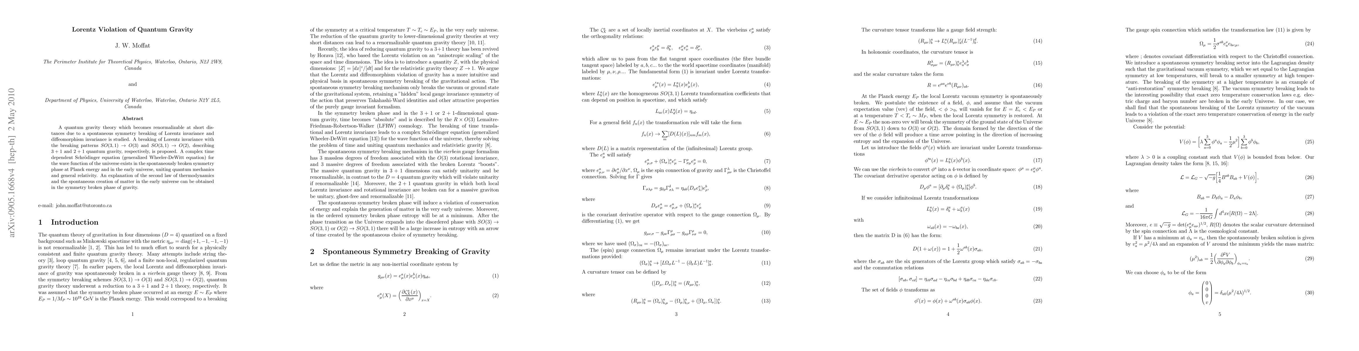 This paper explores a renormalizable quantum gravity theory that arises from spontaneous symmetry breaking of Lorentz and diffeomorphism invariance, proposing specific breaking patterns. It introduces a complex time-dependent Schrödinger equation for the universe's wave function, providing a framework to unify quantum mechanics and general relativity, and explaining the second law of thermodynamics and the origin of matter in the early universe.