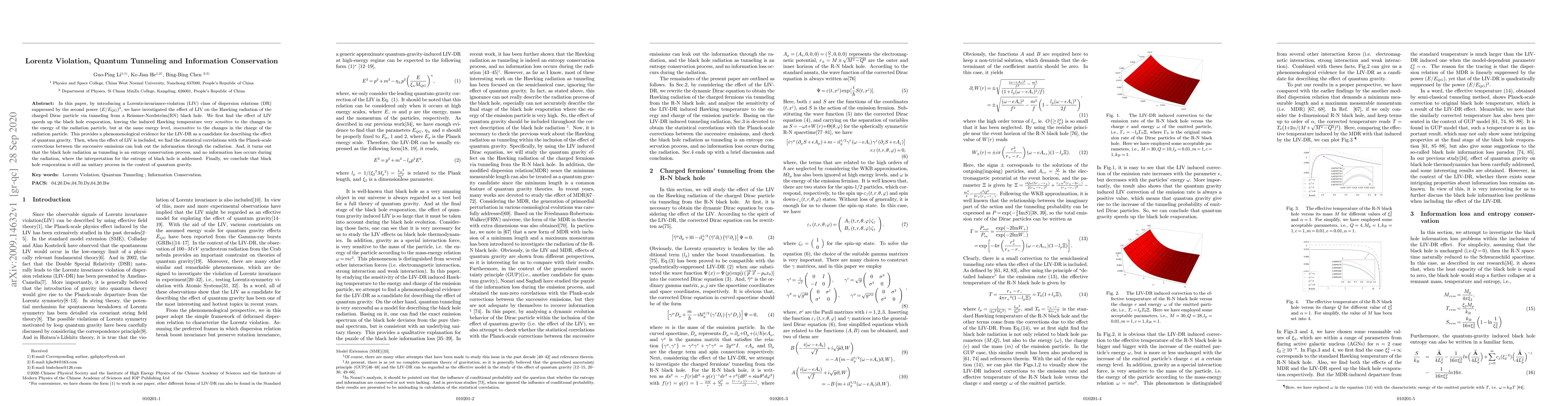 In this paper, by introducing a Lorentz-invariance-violation (LIV) class of dispersion relations (DR) suppressed by the second power $(E/E_{QG})^2$, we have investigated the effect of LIV on the Hawking radiation of the charged Dirac particle via tunneling from a Reissner-Nordstr\"om(RN) black hole. We first find the effect of LIV speeds up the black hole evaporation, leaving the induced Hawking temperature very sensitive to the changes in the energy of the radiation particle, but at the same energy level, insensitive to the changes in the charge of the radiation particle. This provides a phenomenological evidence for the LIV-DR as a candidate for describing the effect of quantum gravity. Then, when the effect of LIV is included, we find the statistical correlations with the Planck-scale corrections between the successive emissions can leak out the information through the radiation. And, it turns out that the black hole radiation as tunneling is an entropy conservation process, and no information loss occurs during the radiation, where the interpretation for the entropy of black hole is addressed. Finally, we conclude that black hole evaporation is still an unitary process in the context of quantum gravity.