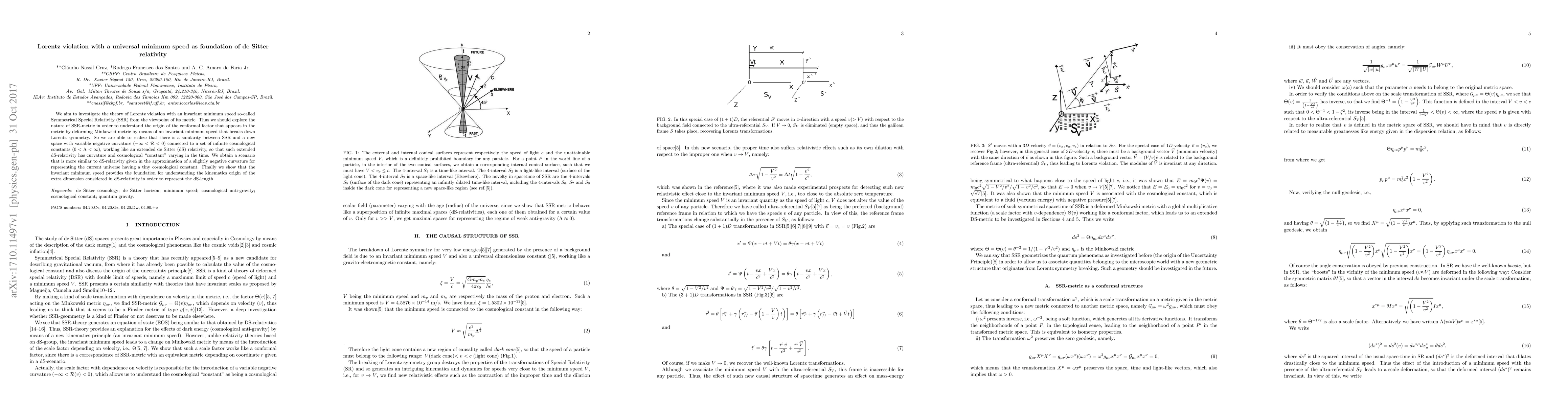We aim to investigate the theory of Lorentz violation with an invariant minimum speed so-called Symmetrical Special Relativity (SSR) from the viewpoint of its metric. Thus we should explore the nature of SSR-metric in order to understand the origin of the conformal factor that appears in the metric by deforming Minkowski metric by means of an invariant minimum speed that breaks down Lorentz symmetry. So we are able to realize that there is a similarity between SSR and a new space with variable negative curvature ($-\infty<\mathcal R<0$) connected to a set of infinite cosmological constants ($0<\Lambda<\infty$), working like an extended de Sitter (dS) relativity, so that such extended dS-relativity has curvature and cosmological "constant" varying in the time. We obtain a scenario that is more similar to dS-relativity given in the approximation of a slightly negative curvature for representing the current universe having a tiny cosmological constant. Finally we show that the invariant minimum speed provides the foundation for understanding the kinematics origin of the extra dimension considered in dS-relativity in order to represent the dS-length.