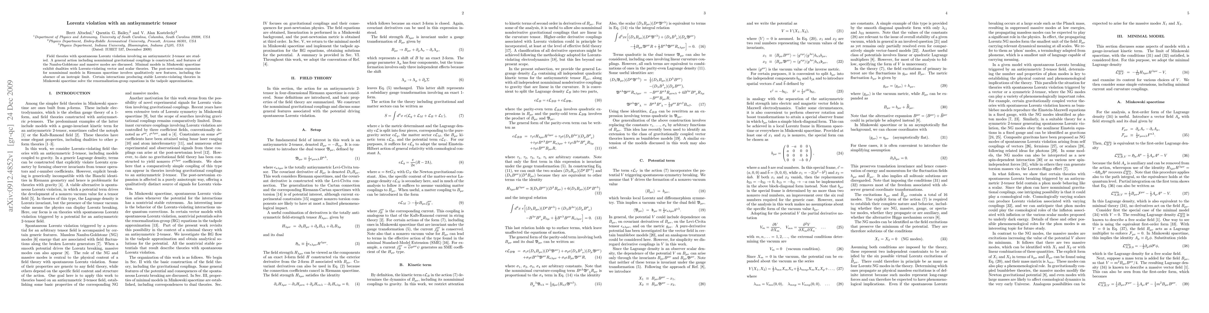 Field theories with spontaneous Lorentz violation involving an antisymmetric 2-tensor are studied. A general action including nonminimal gravitational couplings is constructed, and features of the Nambu-Goldstone and massive modes are discussed. Minimal models in Minkowski spacetime exhibit dualities with Lorentz-violating vector and scalar theories. The post-newtonian expansion for nonminimal models in Riemann spacetime involves qualitatively new features, including the absence of an isotropic limit. Certain interactions producing stable Lorentz-violating theories in Minkowski spacetime solve the renormalization-group equations in the tadpole approximation.