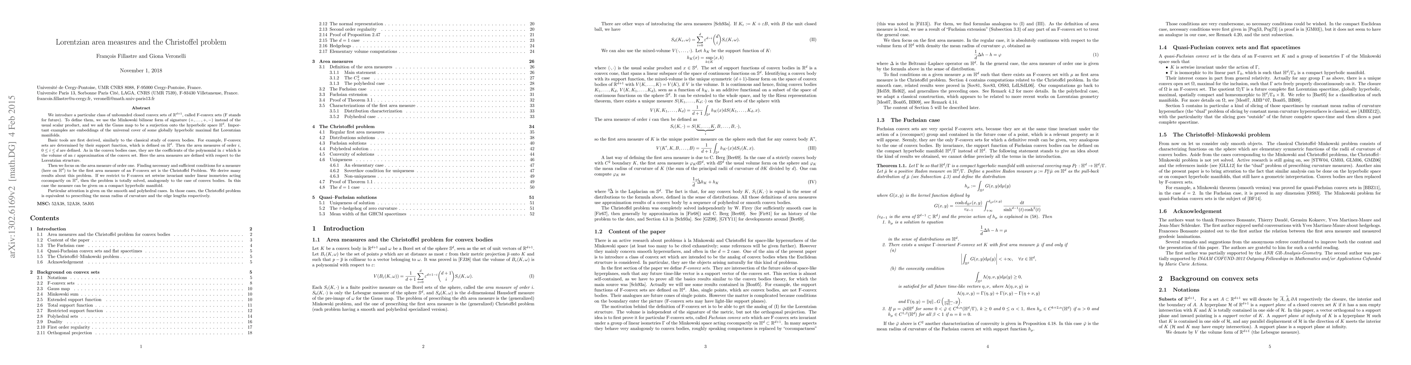 We introduce a particular class of unbounded closed convex sets of $\R^{d+1}$, called F-convex sets (F stands for future). To define them, we use the Minkowski bilinear form of signature $(+,...,+,-)$ instead of the usual scalar product, and we ask the Gauss map to be a surjection onto the hyperbolic space $\H^d$. Important examples are embeddings of the universal cover of so-called globally hyperbolic maximal flat Lorentzian manifolds. Basic tools are first derived, similarly to the classical study of convex bodies. For example, F-convex sets are determined by their support function, which is defined on $\H^d$. Then the area measures of order $i$, $0\leq i\leq d$ are defined. As in the convex bodies case, they are the coefficients of the polynomial in $\epsilon$ which is the volume of an $\epsilon$ approximation of the convex set. Here the area measures are defined with respect to the Lorentzian structure. Then we focus on the area measure of order one. Finding necessary and sufficient conditions for a measure (here on $\H^d$) to be the first area measure of a F-convex set is the Christoffel Problem. We derive many results about this problem. If we restrict to "Fuchsian" F-convex set (those who are invariant under linear isometries acting cocompactly on $\H^d$), then the problem is totally solved, analogously to the case of convex bodies. In this case the measure can be given on a compact hyperbolic manifold. Particular attention is given on the smooth and polyhedral cases. In those cases, the Christoffel problem is equivalent to prescribing the mean radius of curvature and the edge lengths respectively.