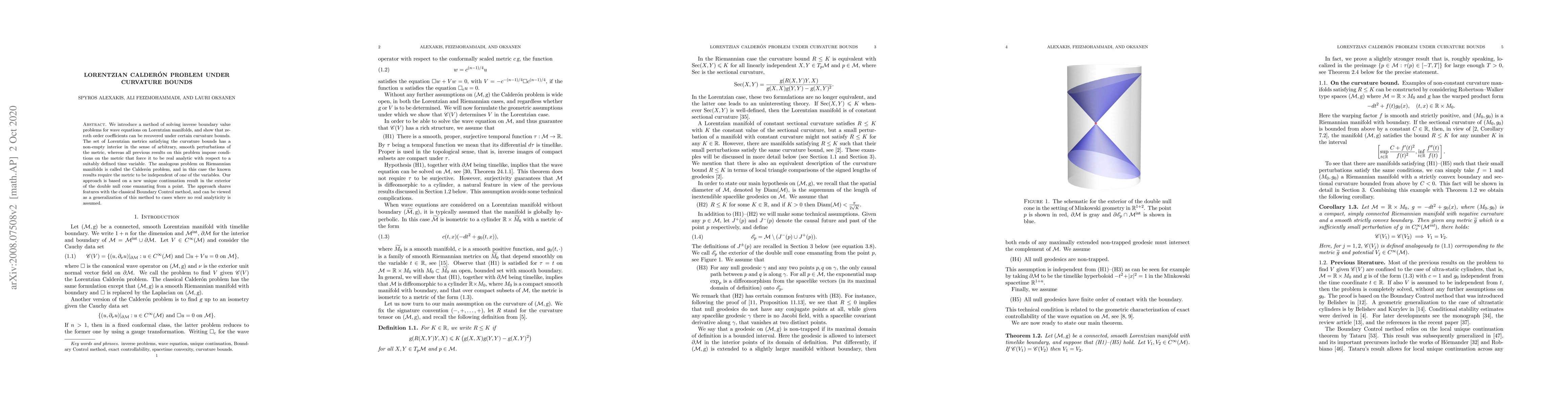 We introduce a method of solving inverse boundary value problems for wave equations on Lorentzian manifolds, and show that zeroth order coefficients can be recovered under certain curvature bounds. The set of Lorentzian metrics satisfying the curvature bounds has a non-empty interior in the sense of arbitrary, smooth perturbations of the metric, whereas all previous results on this problem impose conditions on the metric that force it to be real analytic with respect to a suitably defined time variable. The analogous problem on Riemannian manifolds is called the Calder\'on problem, and in this case the known results require the metric to be independent of one of the variables. Our approach is based on a new unique continuation result in the exterior of the double null cone emanating from a point. The approach shares features with the classical Boundary Control method, and can be viewed as a generalization of this method to cases where no real analyticity is assumed.