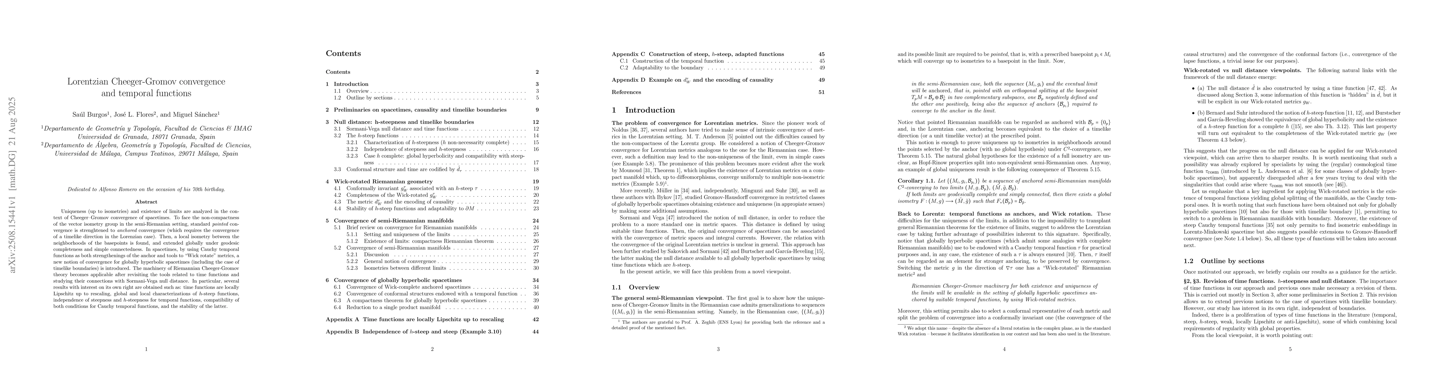 Uniqueness (up to isometries) and existence of limits are analyzed in the context of Cheeger-Gromov convergence of spacetimes. To face the non-compactness of the vector isometry group in the semi-Riemanian setting, standard \em{pointed} convergence is strenghtened to \em{anchored} convergence (which requires the convergence of a timelike direction in the Lorenzian case). Then, a local isometry between the neighborhoods of the basepoints is found, and extended globally under geodesic completeness and simple connectedness. In spacetimes, by using Cauchy temporal functions as both strengthenings of the anchor and tools to ``Wick rotate'' metrics, a new notion of convergence for globally hyperbolic spacetimes (including the case of timelike boundaries) is introduced. The machinery of Riemannian Cheeger-Gromov theory becomes applicable after revisiting the tools related to time functions and studying their connections with Sormani-Vega null distance. In particular, several results with interest on its own right are obtained such as: time functions are locally Lipschitz up to rescaling, global and local characterizations of $h$-steep functions, independence of steepness and $h$-steepness for temporal functions, compatibility of both conditions for Cauchy temporal functions, and the stability of the latter.