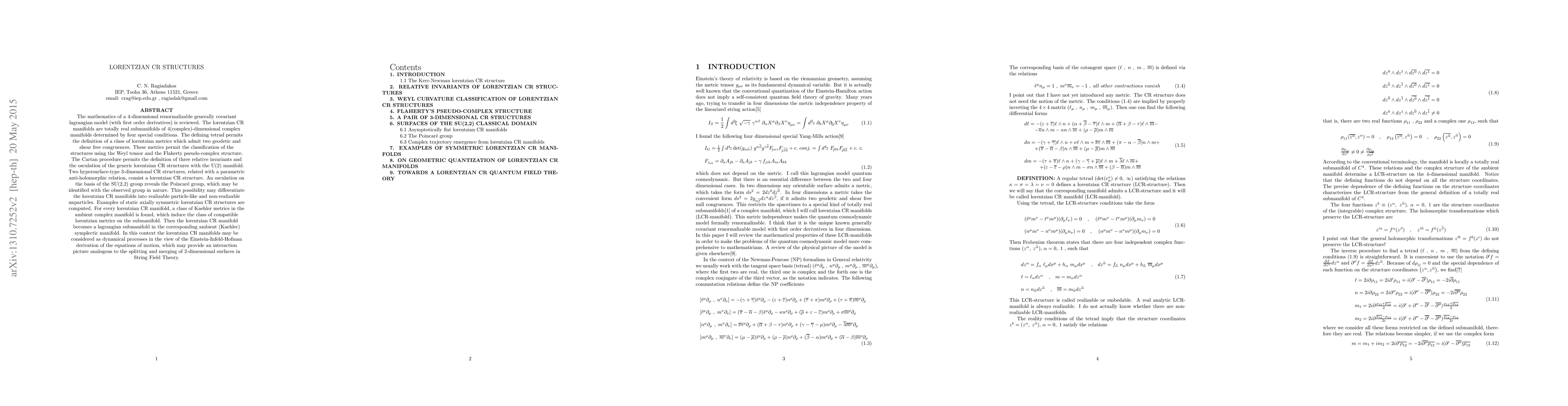The mathematics of a 4-dimensional renormalizable generally covariant lagrangian model (with first order derivatives) is reviewed. The lorentzian CR manifolds are totally real submanifolds of 4(complex)-dimensional complex manifolds determined by four special conditions. The defining tetrad permits the definition of a class of lorentzian metrics which admit two geodetic and shear free congruences. These metrics permit the classification of the structures using the Weyl tensor and the Flaherty pseudo-complex structure. The Cartan procedure permits the definition of three relative invariants. Viewed as a pair of two hypersurface-type 3-dimensional CR structures, the lorentzian CR structures may be osculated on the basis of SU(1,2) group. An osculation on the basis of SU(2,2) group reveals the Poincare group which may be identified with the observed group in nature. Examples of static axially symmetric lorentzian CR structures are computed. For every lorentzian CR manifold, a class of Kaehler metrics of the ambient complex manifold is found, which induce the class of compatible lorentzian metrics on the submanifold. Then the lorentzian CR manifold becomes a lagrangian submanifold in the corresponding ambient (Kaehler) symplectic manifold. The lorentzian CR manifolds may be considered as dynamical processes in the context of the Einstein-Infeld-Hofman derivation of the equations of motion.