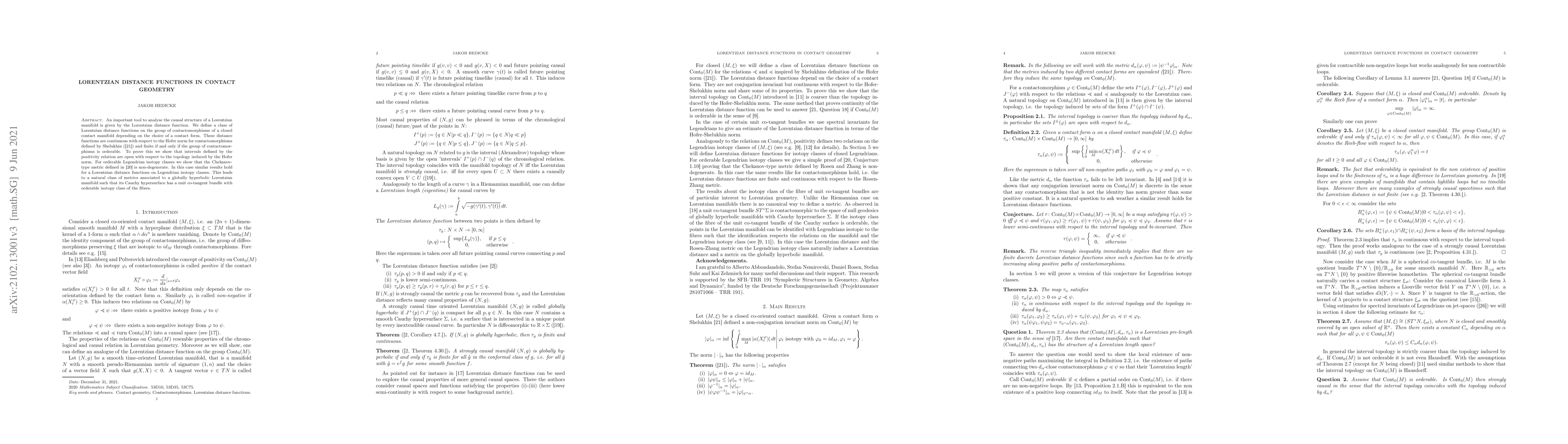 We define a Lorentzian distance function on the group of contactomorphisms of a closed contact manifold. This distance function is continuous with respect to the Hofer norm on the group of contactomorphisms defined by Shelukhin and finite if and only if the group of contactomorphisms is orderable. To prove this we show that intervals defined by the positivity relation are open with respect to the topology induced by the Hofer norm. For orderable Legendrian isotopy classes we show that the Chekanov-type metric defined by Rosen and Zhang is non-degenerate. In this case similar results hold for a Lorentzian distance function on Legendrian isotopy classes. This leads to a natural class of metrics associated to a globally hyperbolic Lorentzian manifold such that its Cauchy hypersurface has a unit co-tangent bundle with orderable isotopy class of the fibres.