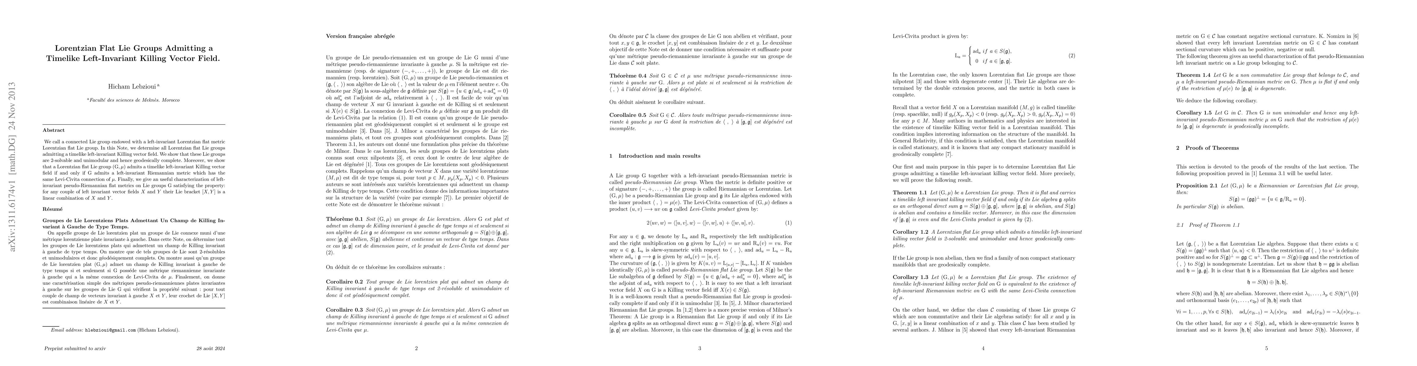 This research identifies Lorentzian flat Lie groups with timelike left-invariant Killing vector fields, proving they are 2-solvable and unimodular, thus geodesically complete. It concludes that such groups admit a timelike Killing vector if they also have a left-invariant Riemannian metric with the same Levi-Civita connection.