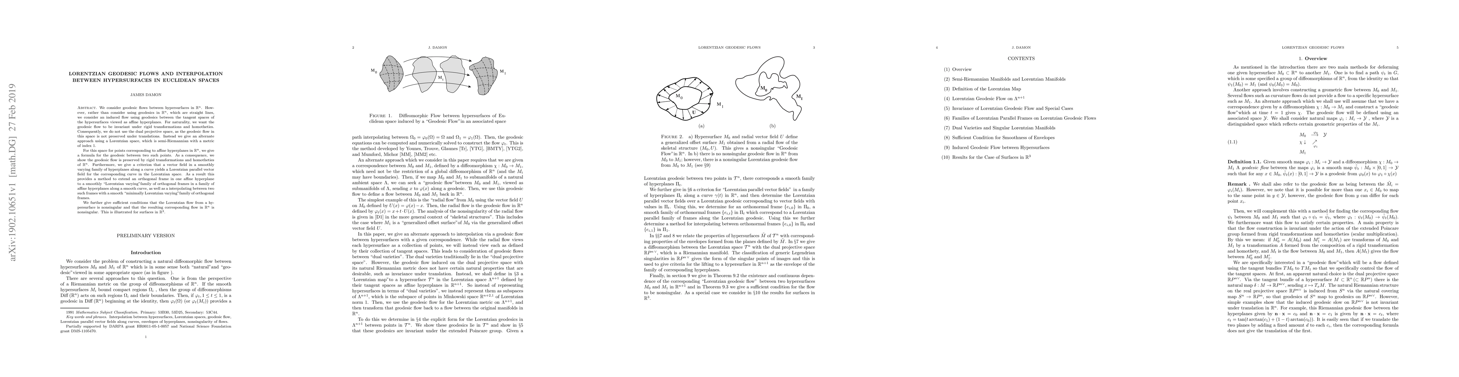 This paper explores the Lorentzian geodesic flow between hypersurfaces in Euclidean spaces, proposing an alternative method using a semi-Riemannian Lorentzian space to maintain invariance under rigid transformations and homotheties. It provides a formula for the geodesic flow in this Lorentzian space and demonstrates its applicability in interpolating between families of affine hyperplanes.