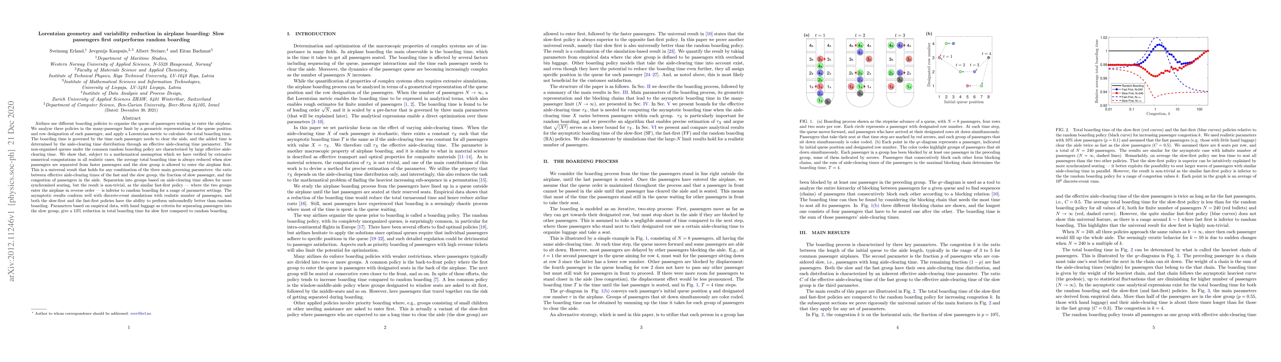 Airlines use different boarding policies to organize the queue of passengers waiting to enter the airplane. We analyze three policies in the many-passenger limit by a geometric representation of the queue position and row designation of each passenger and apply a Lorentzian metric to calculate the total boarding time. The boarding time is governed by the time each passenger needs to clear the aisle, and the added time is determined by the aisle-clearing time distribution through an effective aisle-clearing time parameter. The non-organized queues under the common random boarding policy are characterized by large effective aisle-clearing time. We show that, subject to a mathematical assumption which we have verified by extensive numerical computations in all realistic cases, the average total boarding time is always reduced when slow passengers are separated from faster passengers and the slow group is allowed to enter the airplane first. This is a universal result that holds for any combination of the three main governing parameters: the ratio between effective aisle-clearing times of the fast and the slow group, the fraction of slow passenger, and the congestion of passengers in the aisle. Separation into groups based on aisle-clearing time allows for more synchronized seating, but the result is non-trivial, as the similar fast-first policy -- where the two groups enter the airplane in reverse order -- is inferior to random boarding for a range of parameter settings. The asymptotic results conform well with discrete-event simulations with realistic number of passengers, and both the slow-first and the fast-first policies have the ability to perform unboundedly better than random boarding. Parameters based on empirical data, with hand luggage as criteria for separating passengers into the slow group, give a 13\% reduction in total boarding time for slow first compared to random boarding.