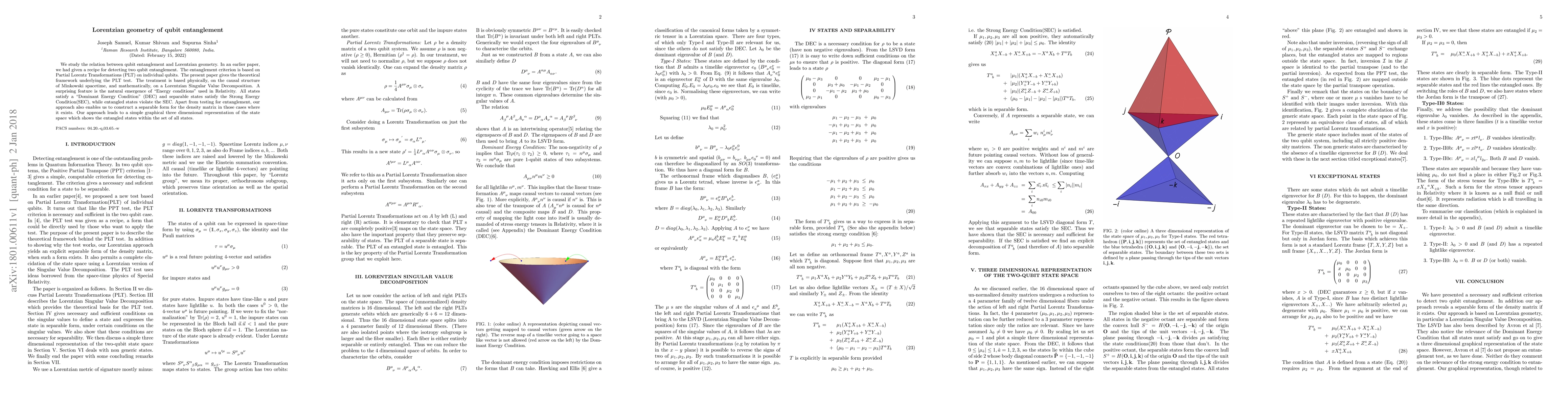 This paper explores the connection between qubit entanglement and Lorentzian geometry, using Partial Lorentz Transformations (PLT) to detect entanglement. It provides a theoretical framework based on the causal structure of Minkowski spacetime and Lorentzian Singular Value Decomposition, revealing the emergence of energy conditions from relativity, with entangled states violating the Strong Energy Condition (SEC).