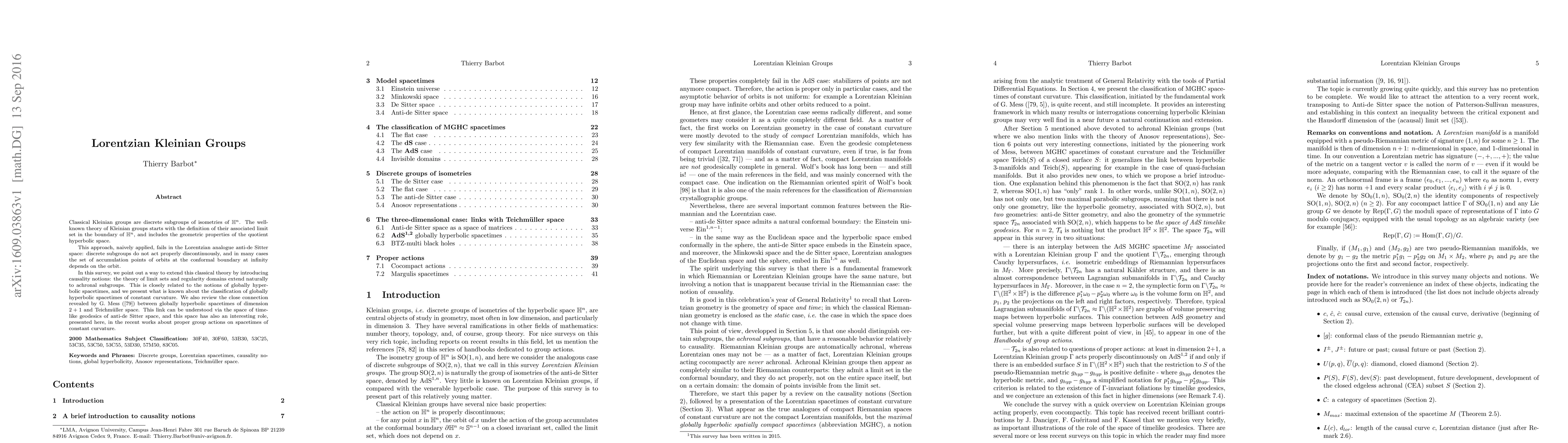 Classical Kleinian groups are discrete subgroups of isometries of H n. The well-known theory of Kleinian groups starts with the definition of their associated limit set in the boundary of H n , and includes the geometric properties of the quotient hyperbolic space. This approach, naively applied, fails in the Lorentzian analogue anti-de Sitter space: discrete subgroups do not act properly discontinuously, and in many cases the set of accumulation points of orbits at the conformal boundary at infinity depends on the orbit. In this survey, we point out a way to extend this classical theory by introducing causality notions: the theory of limit sets and regularity domains extend naturally to achronal subgroups. This is closely related to the notions of globally hyper-bolic spacetimes, and we present what is known about the classification of globally hyperbolic spacetimes of constant curvature. We also review the close connection revealed by G. Mess ([79]) between globally hyperbolic spacetimes of dimension 2 + 1 and Teichm{\"u}ller space. This link can be understood via the space of time-like geodesics of anti-de Sitter space, and this space has also an interesting role, presented here, in the recent works about proper group actions on spacetimes of constant curvature.
