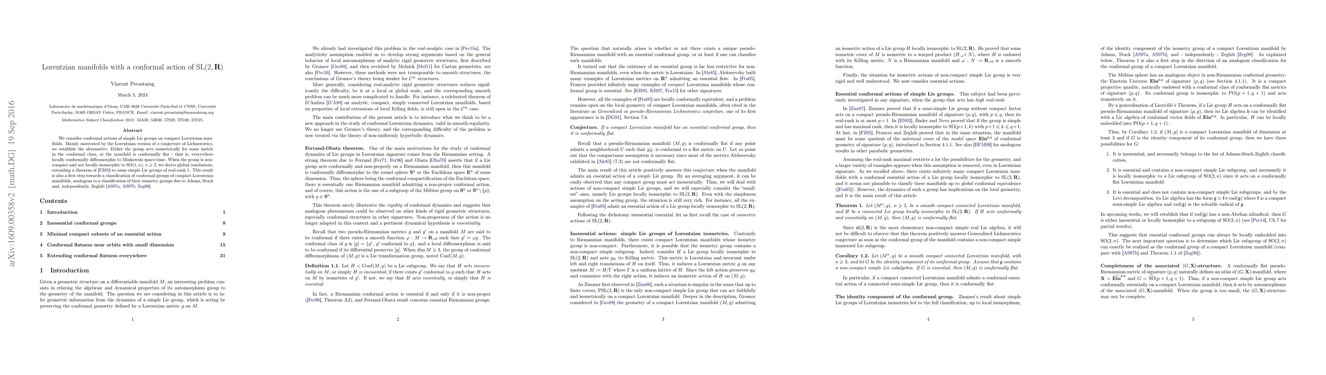 We consider conformal actions of simple Lie groups on compact Lorentzian manifolds. Mainly motivated by the Lorentzian version of a conjecture of Lichnerowicz, we establish the alternative: Either the group acts isometrically for some metric in the conformal class, or the manifold is conformally flat - that is, everywhere locally conformally diffeomorphic to Minkowski space-time. When the group is non-compact and not locally isomorphic to SO(1,n), n>1, we derive global conclusions, extending a theorem of Frances and Zeghib to some simple Lie groups of real-rank 1. This result is also a first step towards a classification of the conformal groups of compact Lorentz manifolds, analogous to a classification of their isometry groups due to Adams, Stuck and, independently, Zeghib at the end of the 1990's.