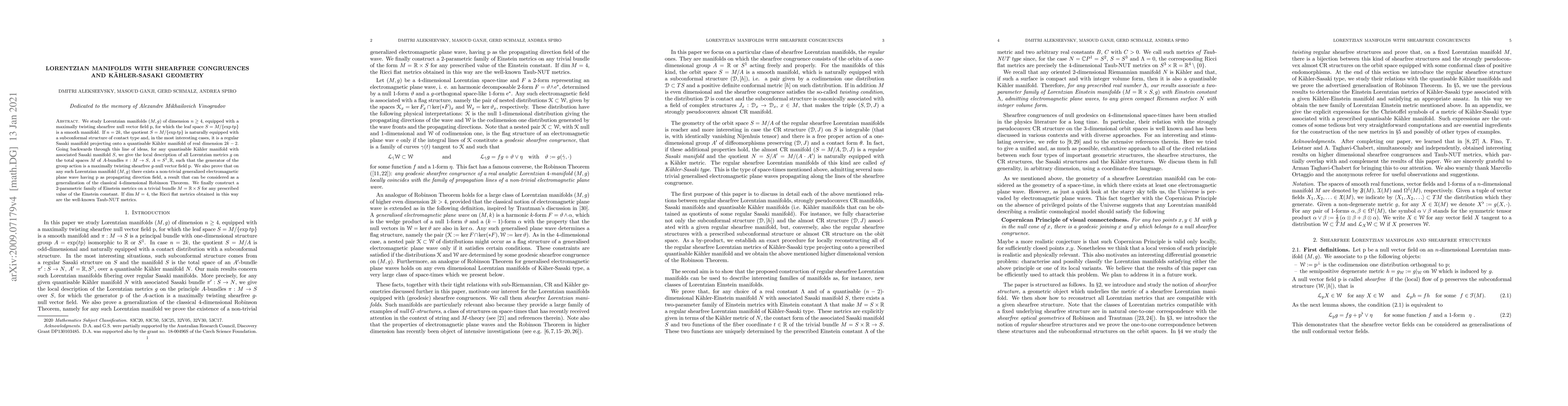 This paper investigates Lorentzian manifolds with shearfree null vector fields, establishing connections to Kähler-Sasaki geometry and constructing Einstein metrics. It describes local metrics on bundles over Sasaki manifolds and generalizes Robinson's theorem on electromagnetic plane waves.