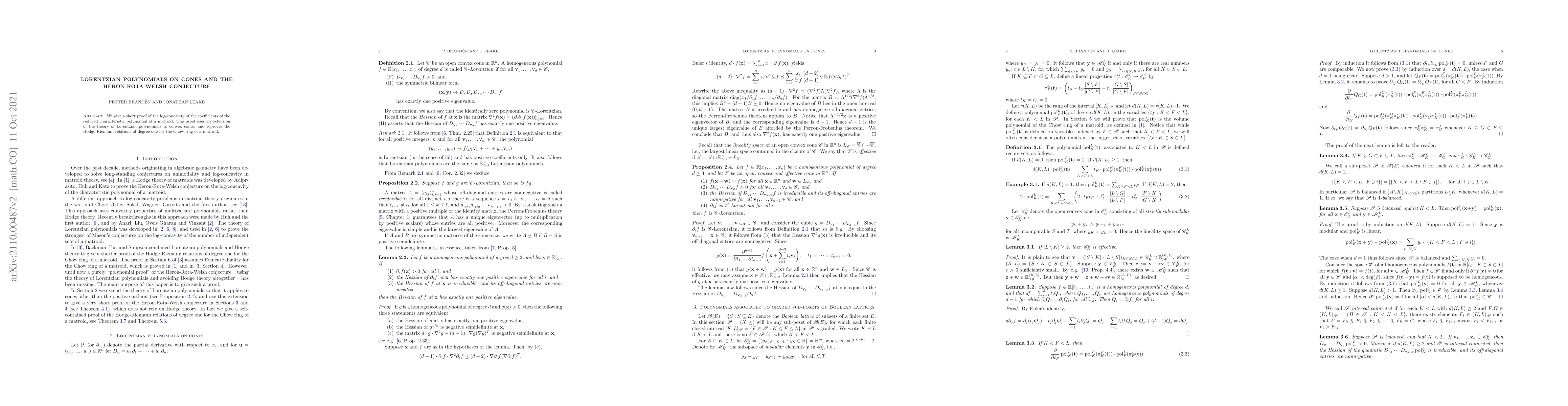 Summary: The paper provides a concise proof of the log-concavity of matroid coefficients using Lorentzian polynomials on convex cones, and reproves the Hodge-Riemann relations for the Chow ring of a matroid. This work supports the Heron-Rota-Welsh conjecture.