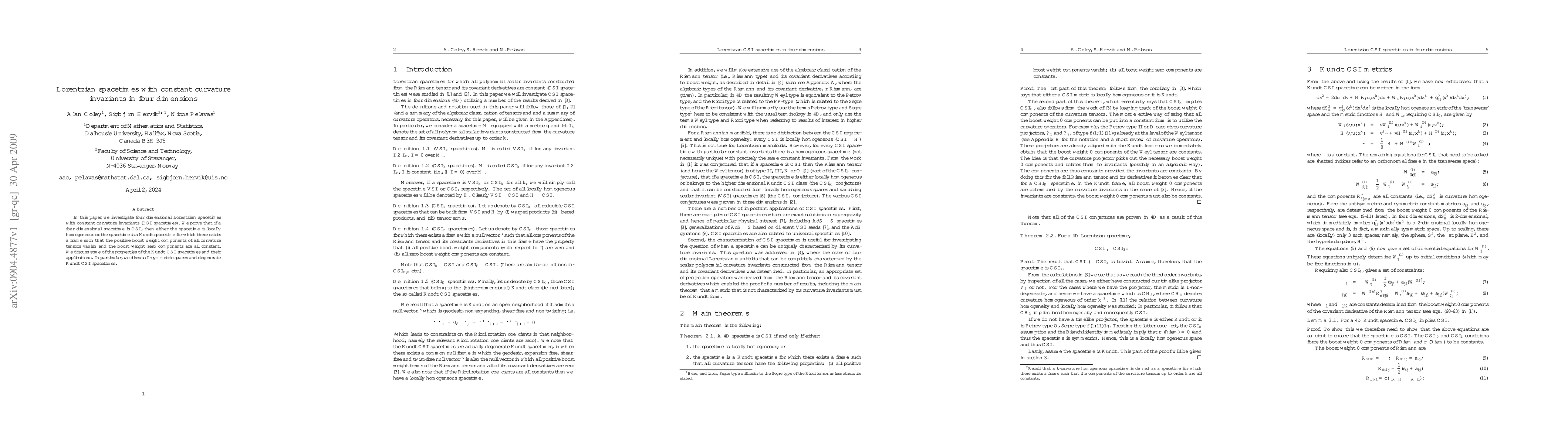 This paper explores four-dimensional Lorentzian spacetimes with constant curvature invariants, proving that such spacetimes are either locally homogeneous or are Kundt spacetimes with specific curvature properties. It also discusses the implications and applications of these findings, particularly focusing on $\mathcal{I}$-symmetric spaces and degenerate Kundt spacetimes.