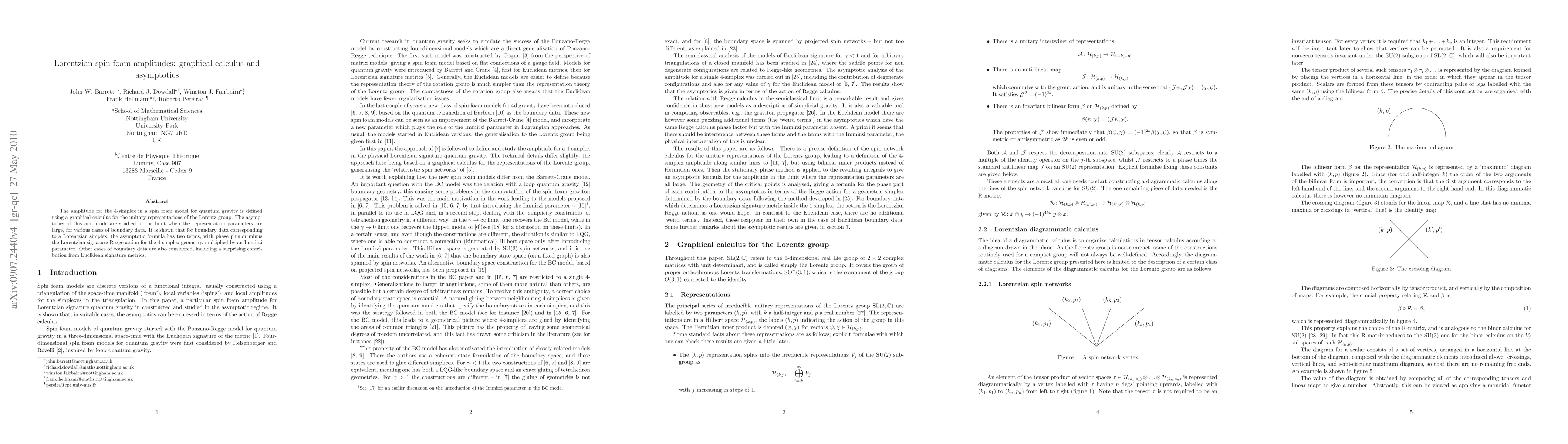 Summary: The research defines spin foam amplitudes for 4-simplices using a graphical calculus for Lorentz group representations, examining their asymptotics for large parameters. It reveals a two-term asymptotic formula for Lorentzian simplex geometries, including a surprising Euclidean contribution.