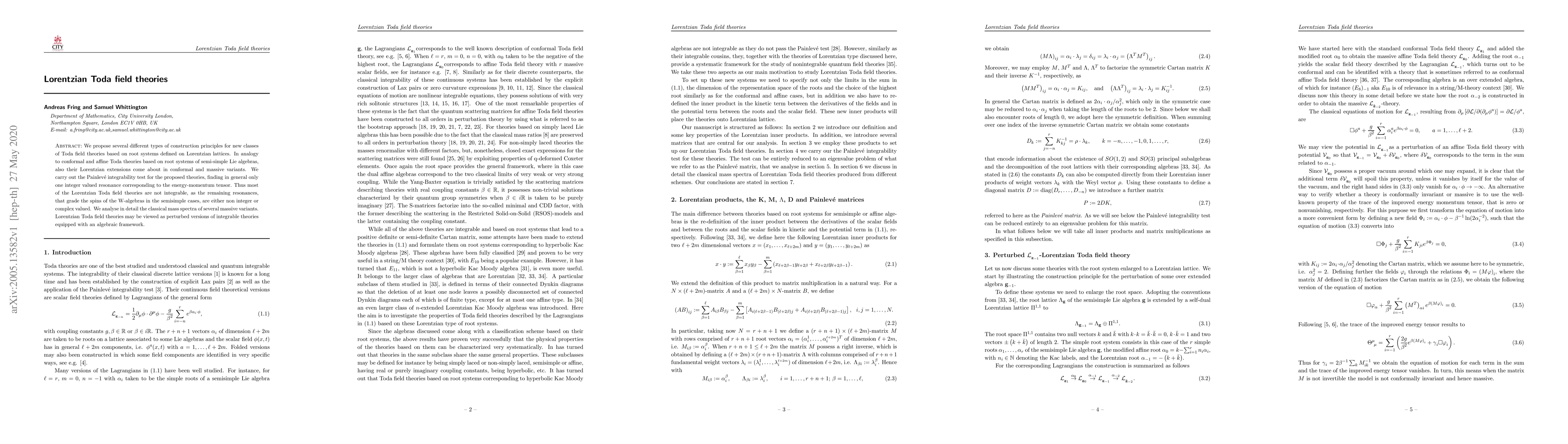 We propose several different types of construction principles for new classes of Toda field theories based on root systems defined on Lorentzian lattices. In analogy to conformal and affine Toda theories based on root systems of semi-simple Lie algebras, also their Lorentzian extensions come about in conformal and massive variants. We carry out the Painlev\'{e} integrability test for the proposed theories, finding in general only one integer valued resonance corresponding to the energy-momentum tensor. Thus most of the Lorentzian Toda field theories are not integrable, as the remaining resonances, that grade the spins of the W-algebras in the semisimple cases, are either non integer or complex valued. We analyse in detail the classical mass spectra of several massive variants. Lorentzian Toda field theories may be viewed as perturbed versions of integrable theories equipped with an algebraic framework.