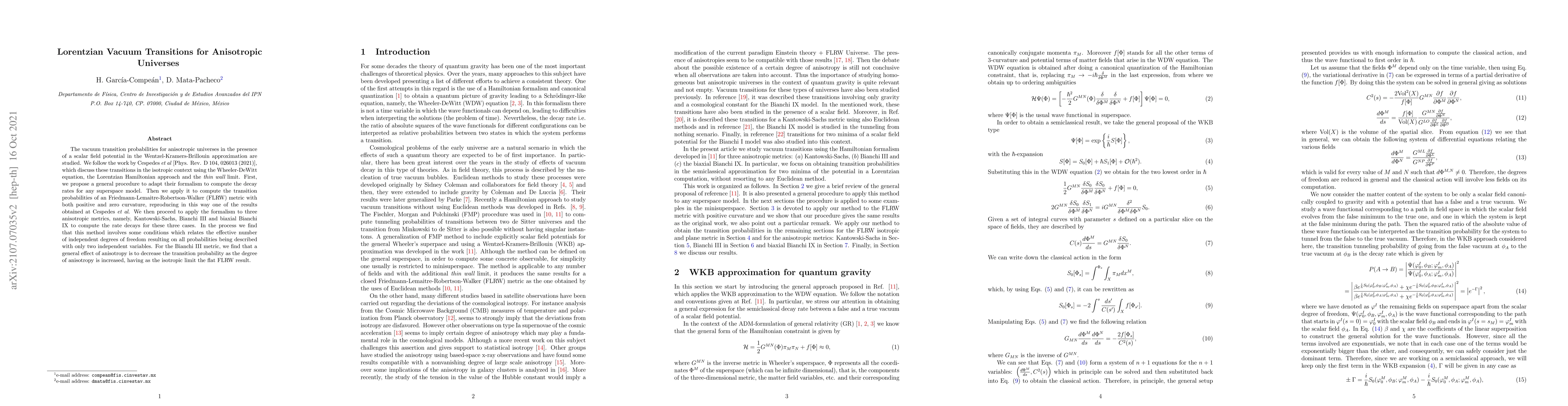 The vacuum transition probabilities for anisotropic universes in the presence of a scalar field potential in the Wentzel-Kramers-Brillouin approximation are studied. We follow the work by Cespedes et al [Phys. Rev. D 104, 026013 (2021)], which discuss these transitions in the isotropic context using the Wheeler-DeWitt equation, the Lorentzian Hamiltonian approach and the thin wall limit. First, we propose a general procedure to adapt their formalism to compute the decay rates for any superspace model. Then we apply it to compute the transition probabilities of an Friedmann-Lemaitre-Robertson-Walker (FLRW) metric with both positive and zero curvature, reproducing in this way one of the results obtained at Cespedes et al. We then proceed to apply the formalism to three anisotropic metrics, namely, Kantowski-Sachs, Bianchi III and biaxial Bianchi IX to compute the rate decays for these three cases. In the process we find that this method involves some conditions which relates the effective number of independent degrees of freedom resulting on all probabilities being described with only two independent variables. For the Bianchi III metric, we find that a general effect of anisotropy is to decrease the transition probability as the degree of anisotropy is increased, having as the isotropic limit the flat FLRW result.