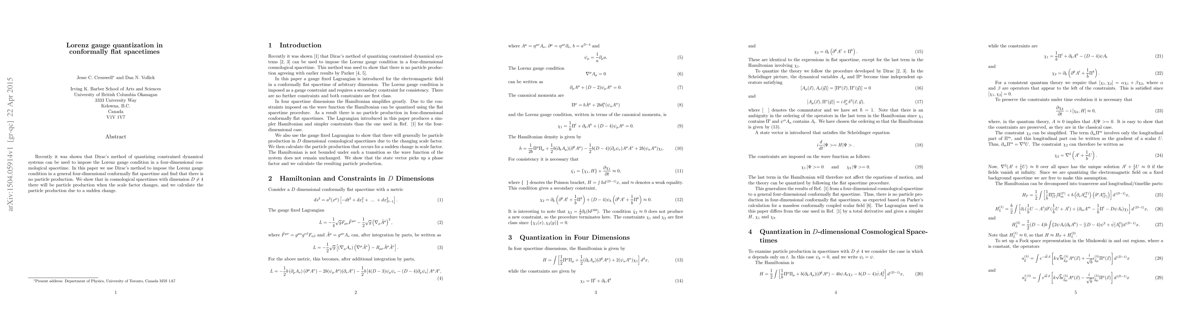 Recently it was shown that Dirac's method of quantizing constrained dynamical systems can be used to impose the Lorenz gauge condition in a four-dimensional cosmological spacetime. In this paper we use Dirac's method to impose the Lorenz gauge condition in a general four-dimensional conformally flat spacetime and find that there is no particle production. We show that in cosmological spacetimes with dimension $D\neq 4$ there will be particle production when the scale factor changes, and we calculate the particle production due to a sudden change.