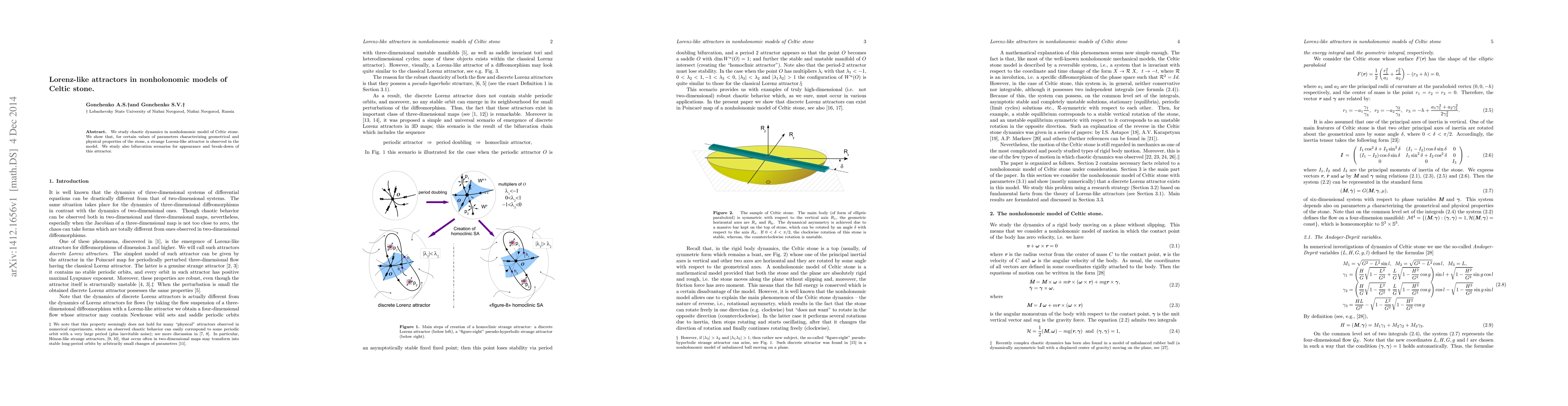 We study chaotic dynamics in nonholonomic model of Celtic stone. We show that, for certain values of parameters characterizing geometrical and physical properties of the stone, a strange Lorenz-like attractor is observed in the model. We study also bifurcation scenarios for appearance and break-down of this attractor.