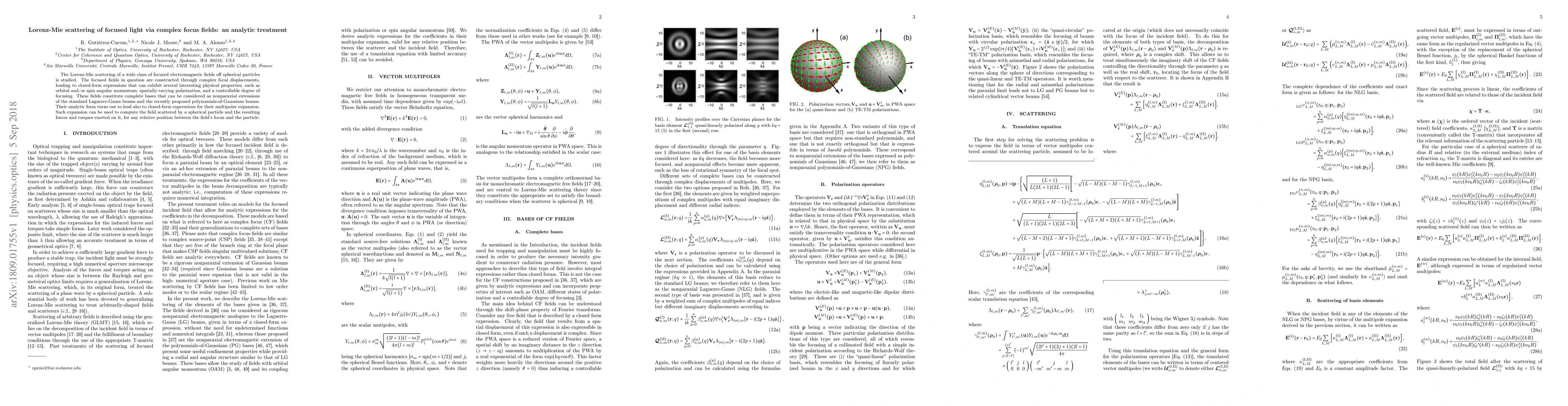 The Lorenz-Mie scattering of a wide class of focused electromagnetic fields off spherical particles is studied. The focused fields in question are constructed through complex focal displacements, leading to closed-form expressions that can exhibit several interesting physical properties, such as orbital and/or spin angular momentum, spatially-varying polarization, and a controllable degree of focusing. These fields constitute complete bases that can be considered as nonparaxial extensions of the standard Laguerre-Gauss beams and the recently proposed polynomials-of-Gaussians beams. Their analytic form turns out to lead also to closed-form expressions for their multipolar expansion. Such expansion can be used to compute the field scattered by a spherical particle and the resulting forces and torques exerted on it, for any relative position between the field's focus and the particle.