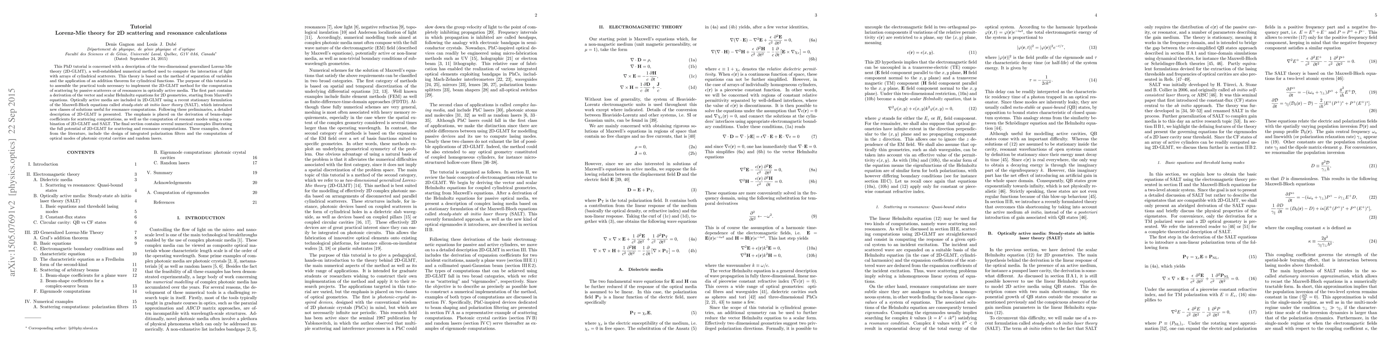 This PhD tutorial is concerned with a description of the two-dimensional generalized Lorenz-Mie theory (2D-GLMT), a well-established numerical method used to compute the interaction of light with arrays of cylindrical scatterers. This theory is based on the method of separation of variables and the application of an addition theorem for cylindrical functions. The purpose of this tutorial is to assemble the practical tools necessary to implement the 2D-GLMT method for the computation of scattering by passive scatterers or of resonances in optically active media. The first part contains a derivation of the vector and scalar Helmholtz equations for 2D geometries, starting from Maxwell's equations. Optically active media are included in 2D-GLMT using a recent stationary formulation of the Maxwell-Bloch equations called steady-state ab initio laser theory (SALT), which introduces new classes of solutions useful for resonance computations. Following these preliminaries, a detailed description of 2D-GLMT is presented. The emphasis is placed on the derivation of beam-shape coefficients for scattering computations, as well as the computation of resonant modes using a combination of 2D-GLMT and SALT. The final section contains several numerical examples illustrating the full potential of 2D-GLMT for scattering and resonance computations. These examples, drawn from the literature, include the design of integrated polarization filters and the computation of optical modes of photonic crystal cavities and random lasers.